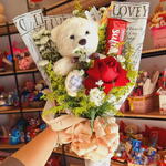 Encante alguém especial com este presente elegante e doce. O conjunto inclui uma bela rosa, um aconchegante ursinho de pelúcia, uma deliciosa barra de chocolate Suflair para agradar o paladar, algumas folhagens para acrescentar um toque de frescura e é finalizado com uma embalagem atraente e um laço charmoso. Um mimo perfeito para marcar qualquer ocasião com uma lembrança carinhosa e deliciosa.