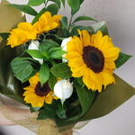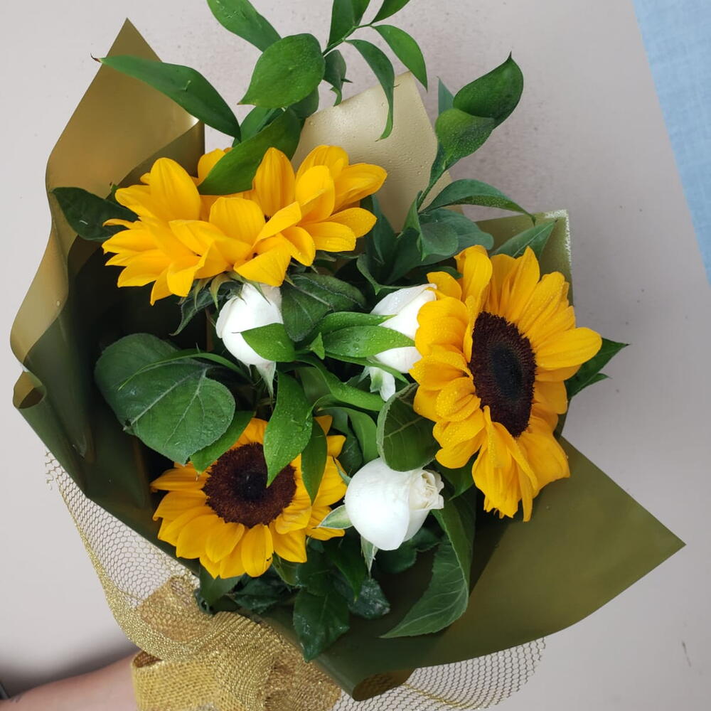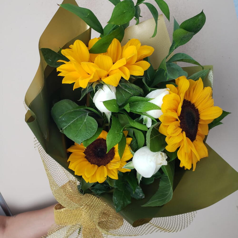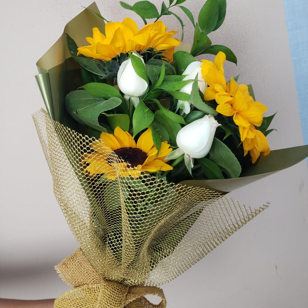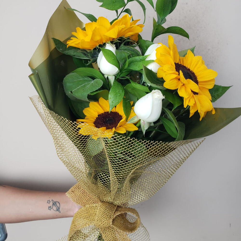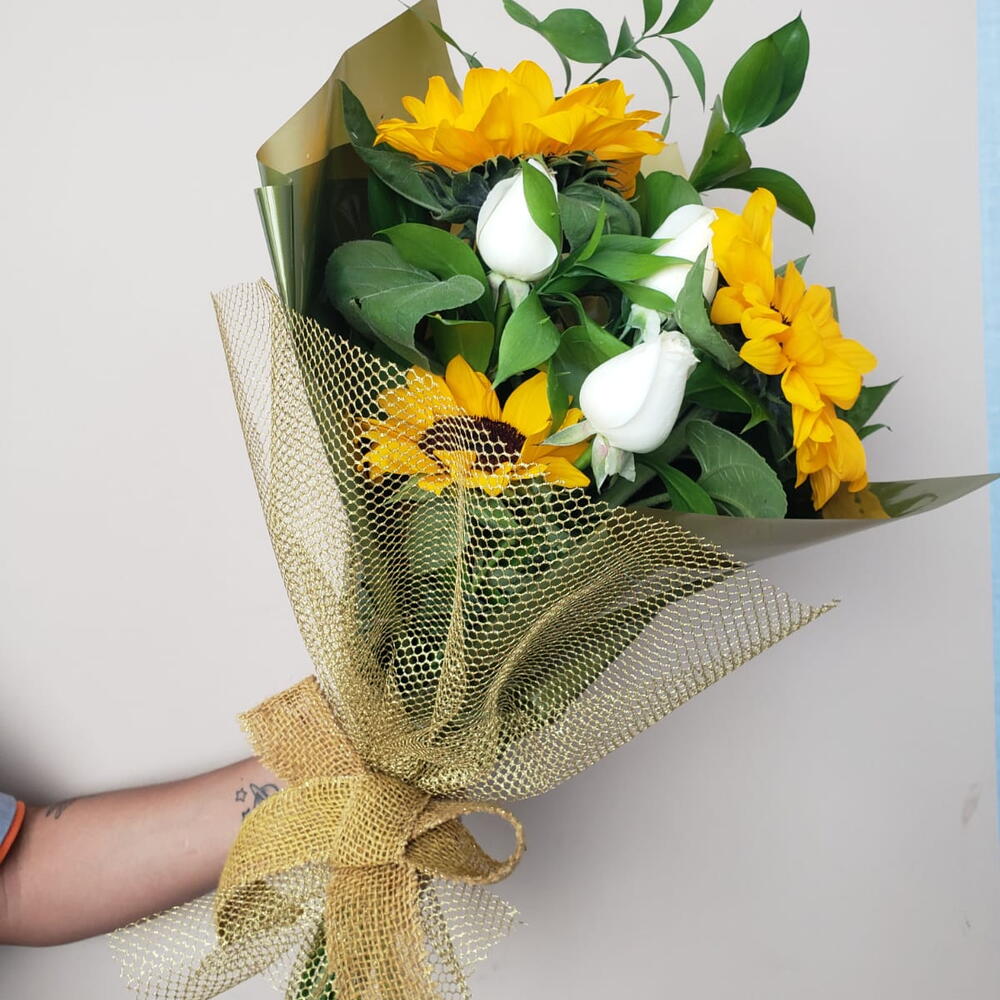 Apresentando um exuberante buquê que combina a vivacidade de 3 girassóis com o romantismo de 3 rosas na cor disponível. Este arranjo floral equilibrado trará um toque de elegância e frescor a qualquer espaço.