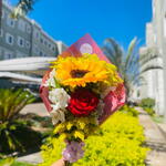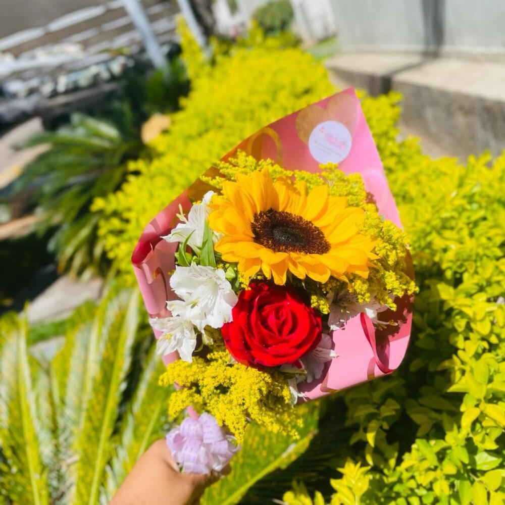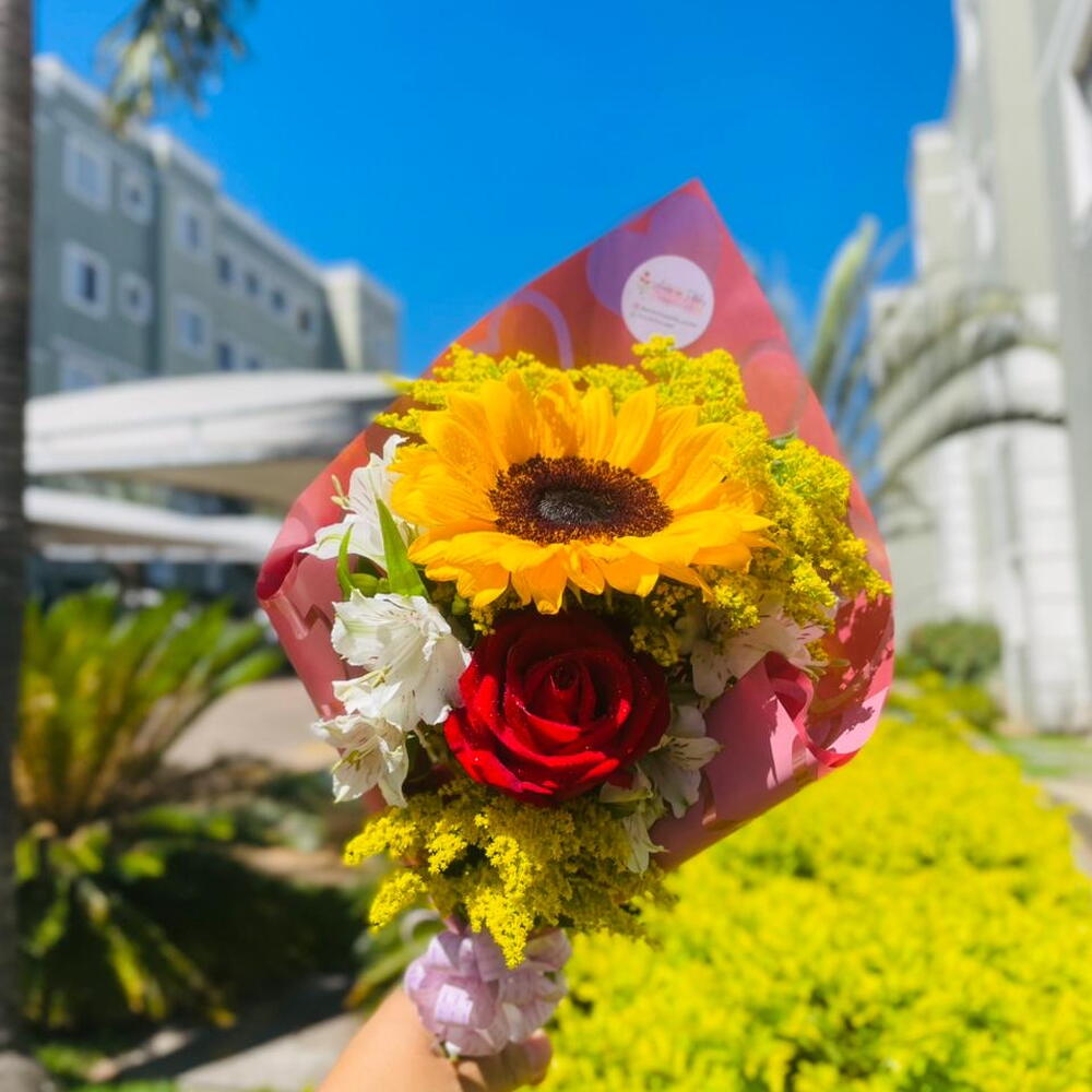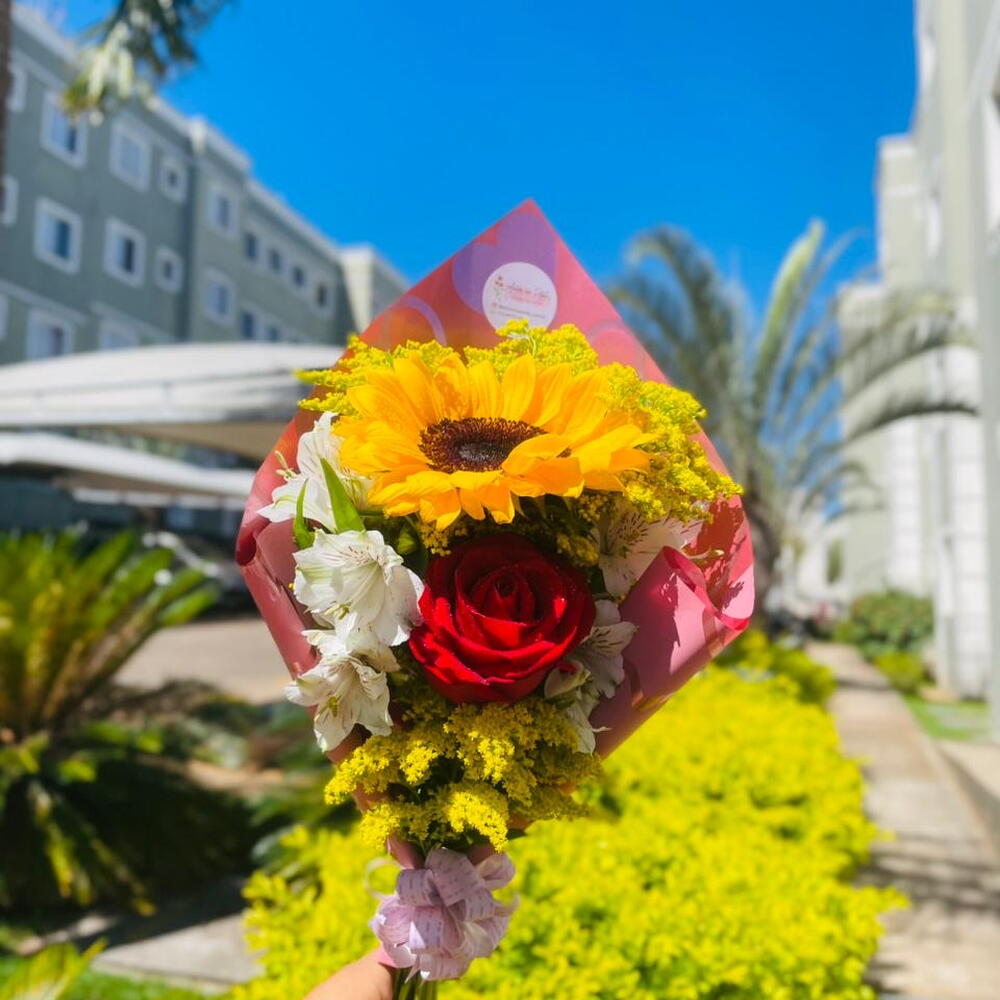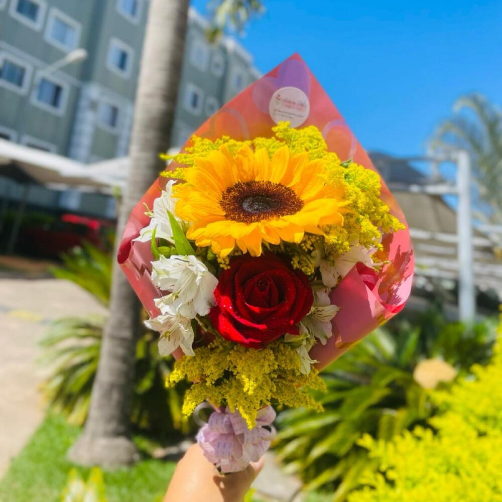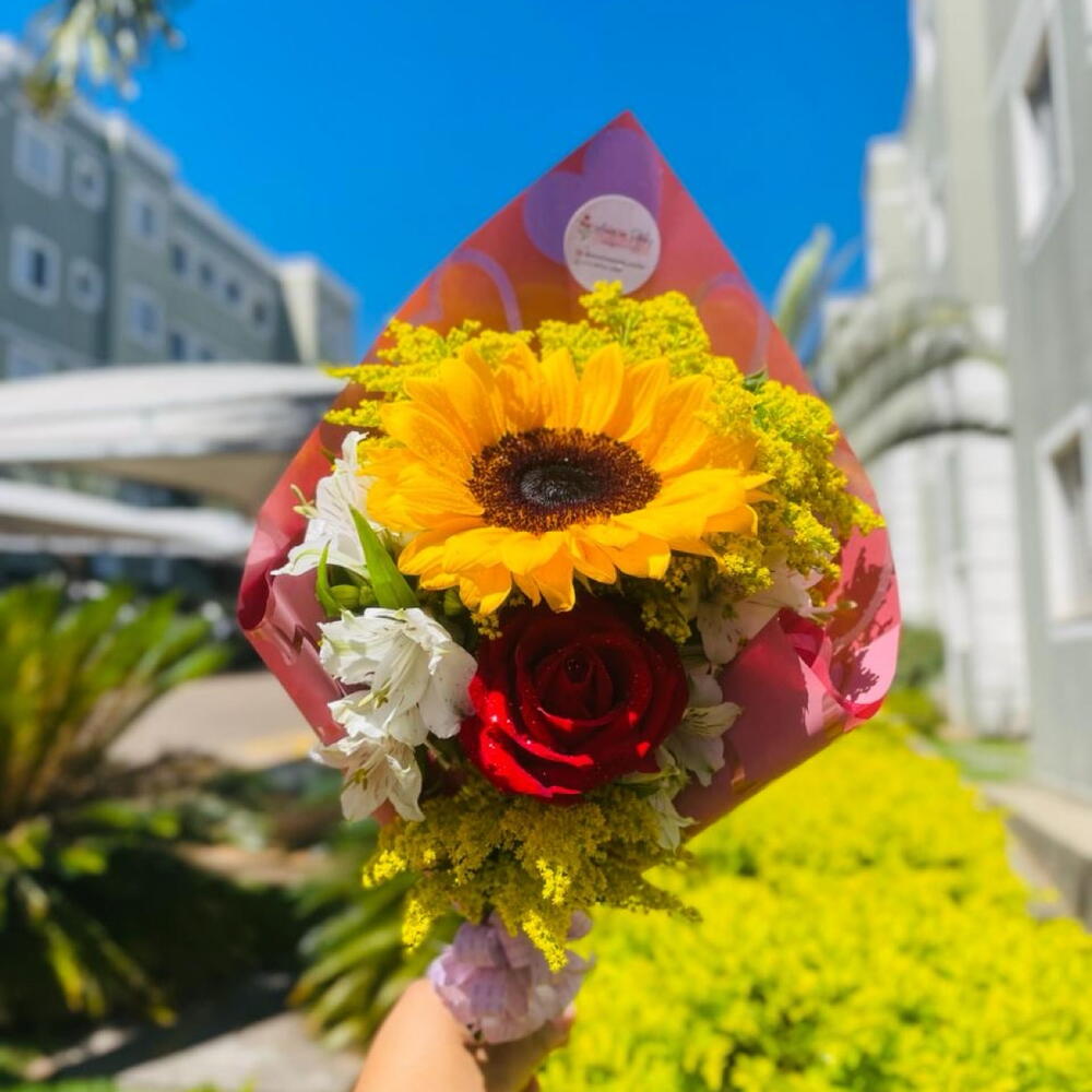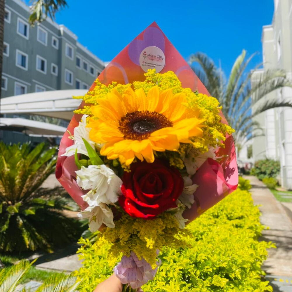 Este buquê é composto por uma bela rosa vermelha e um alegre girassol, ambos envoltos em diversas folhagens que realçam a sua beleza natural. Acompanhado de uma elegante embalagem e um laço charmoso, este é o presente perfeito para iluminar o dia de alguém especial.