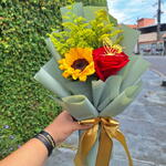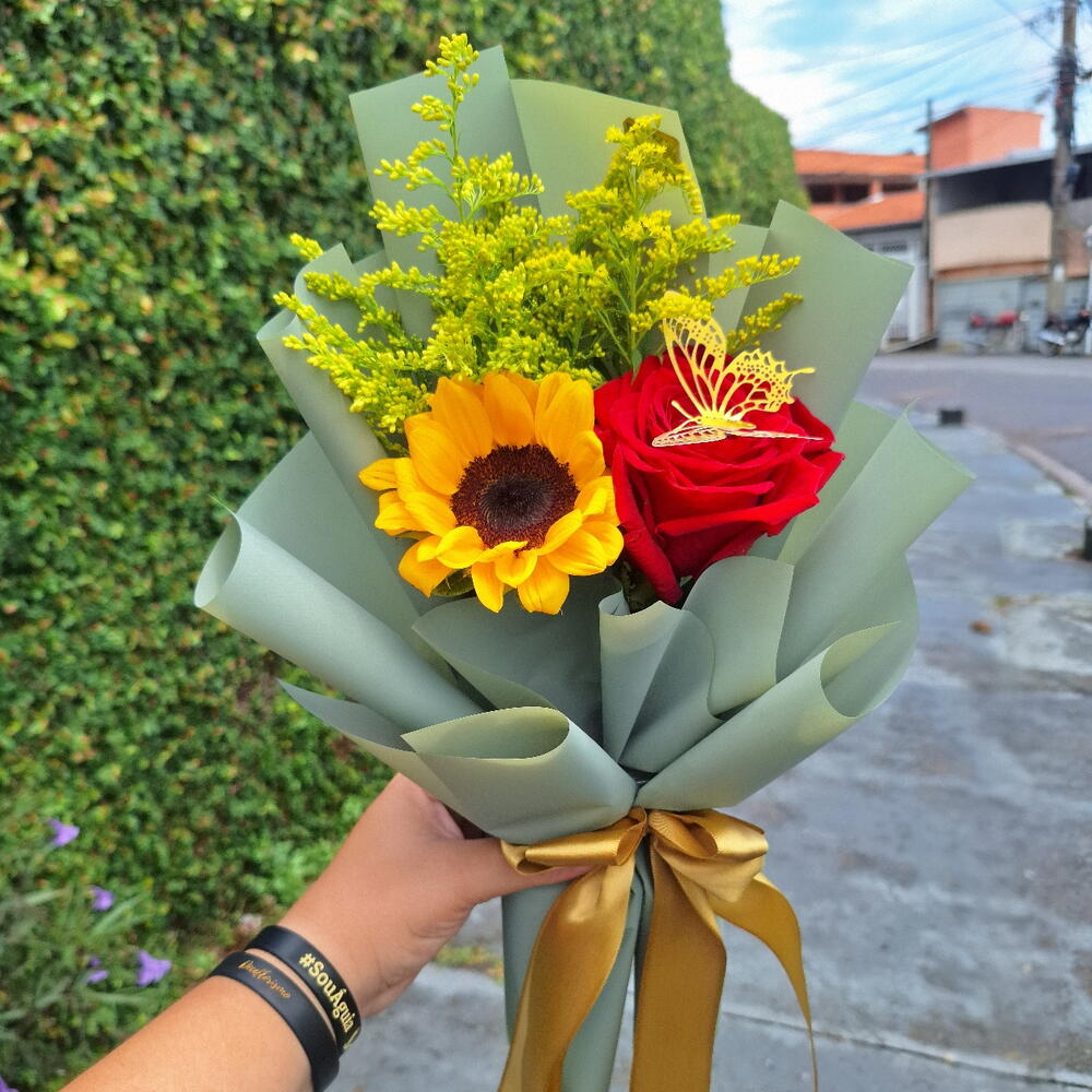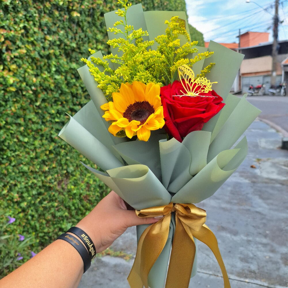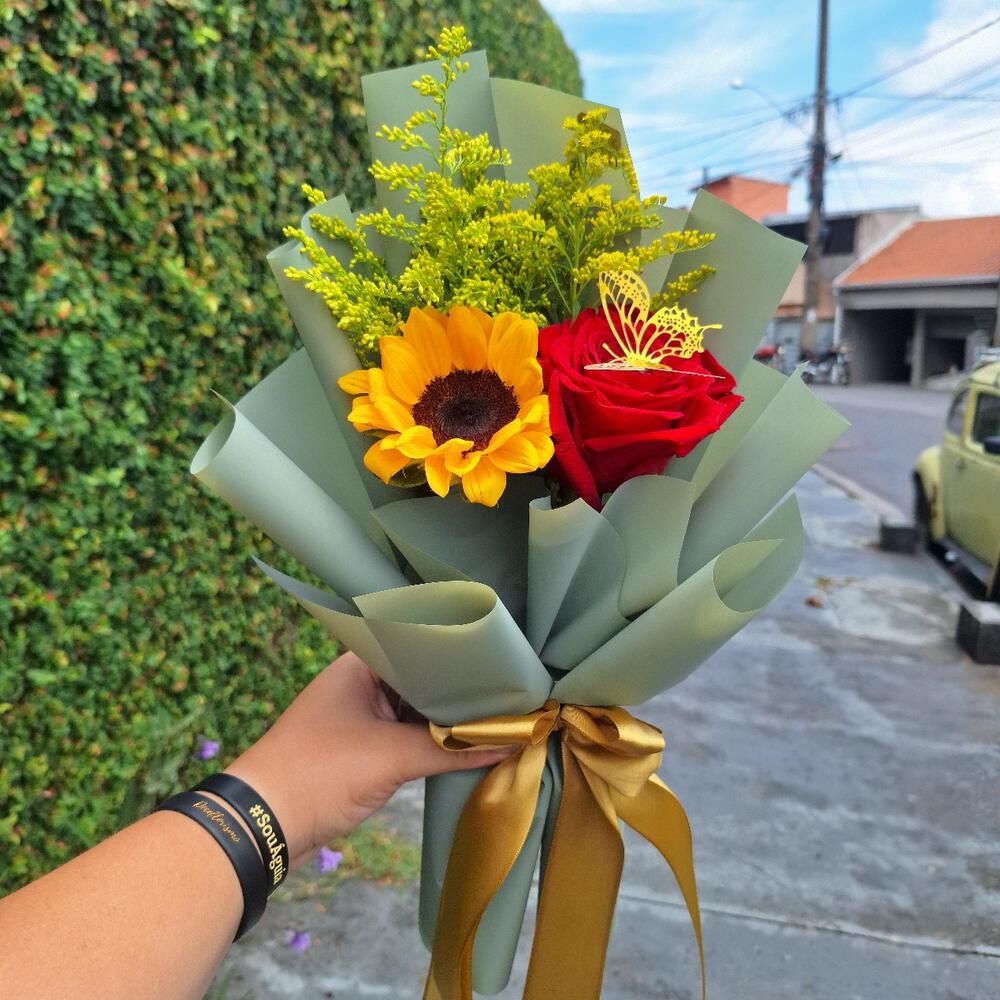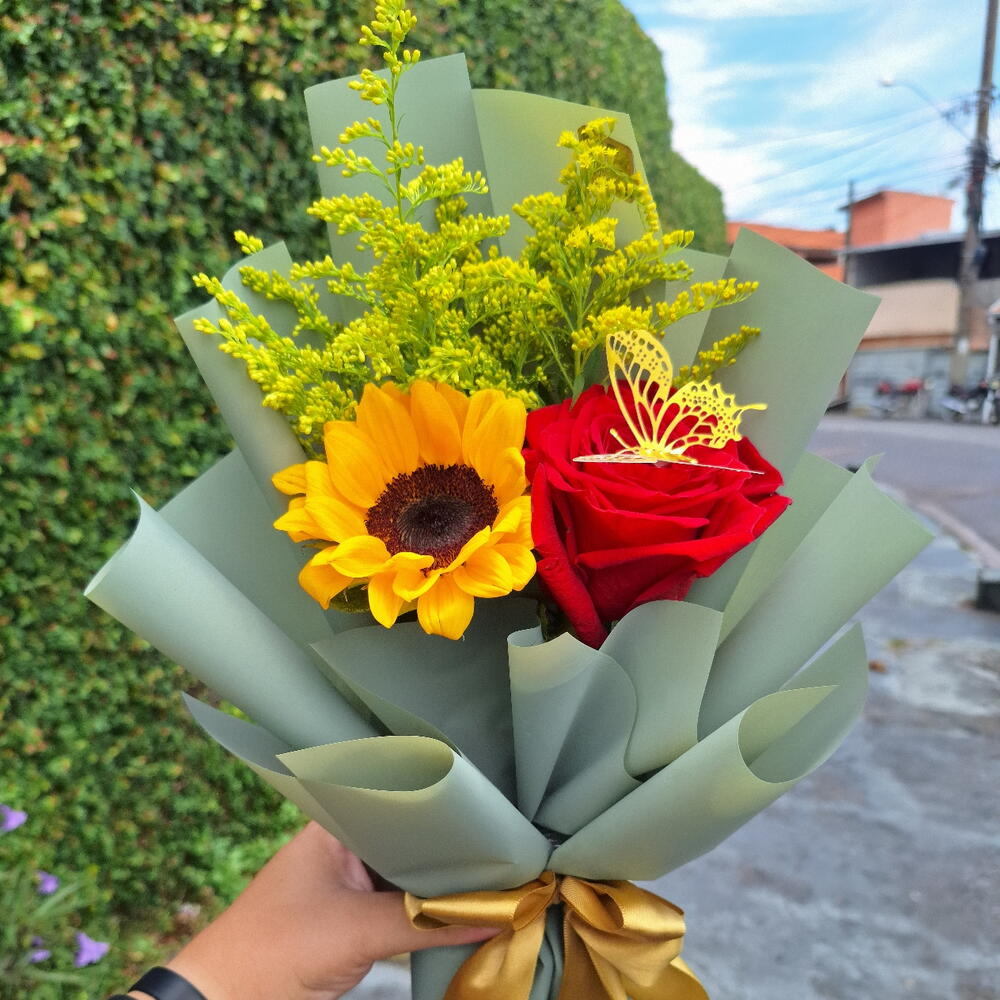 1 Girassol Natural 🌻 1 Rosa Colombiana 🌹 Folhagens tango 🌿 Embrulhado numa linda embalagem jornal romântico ❤️ Acompanha 1 cartão de brinde