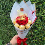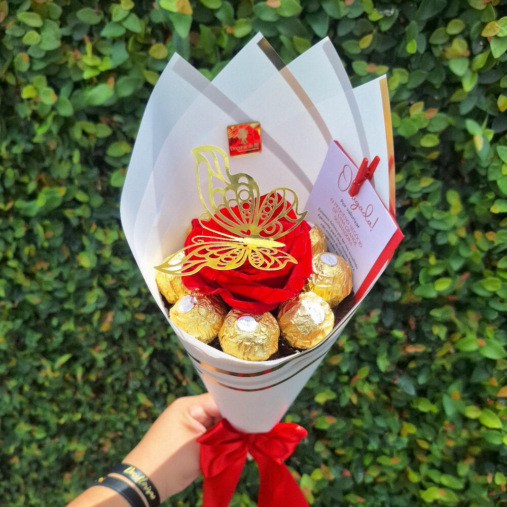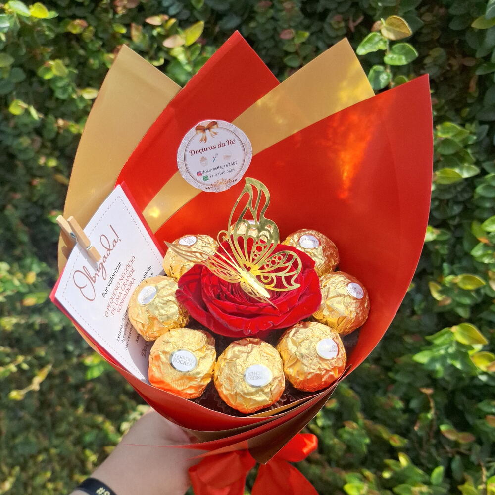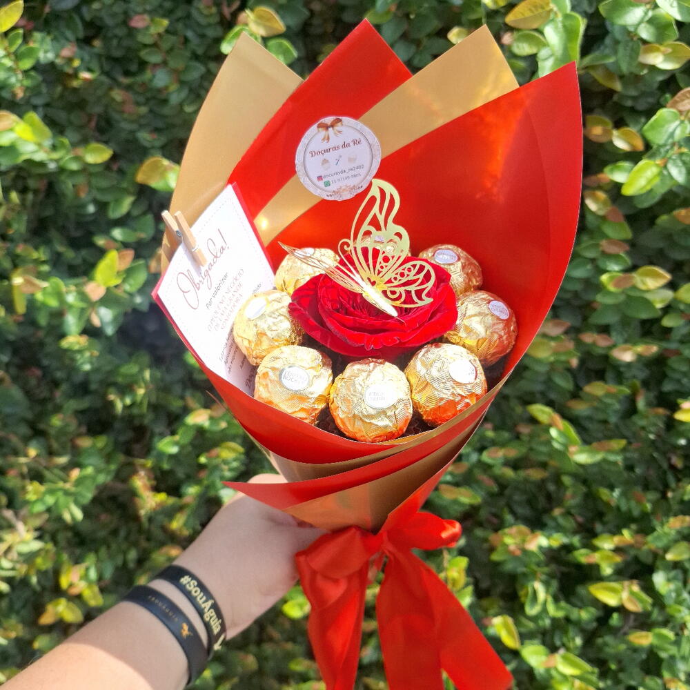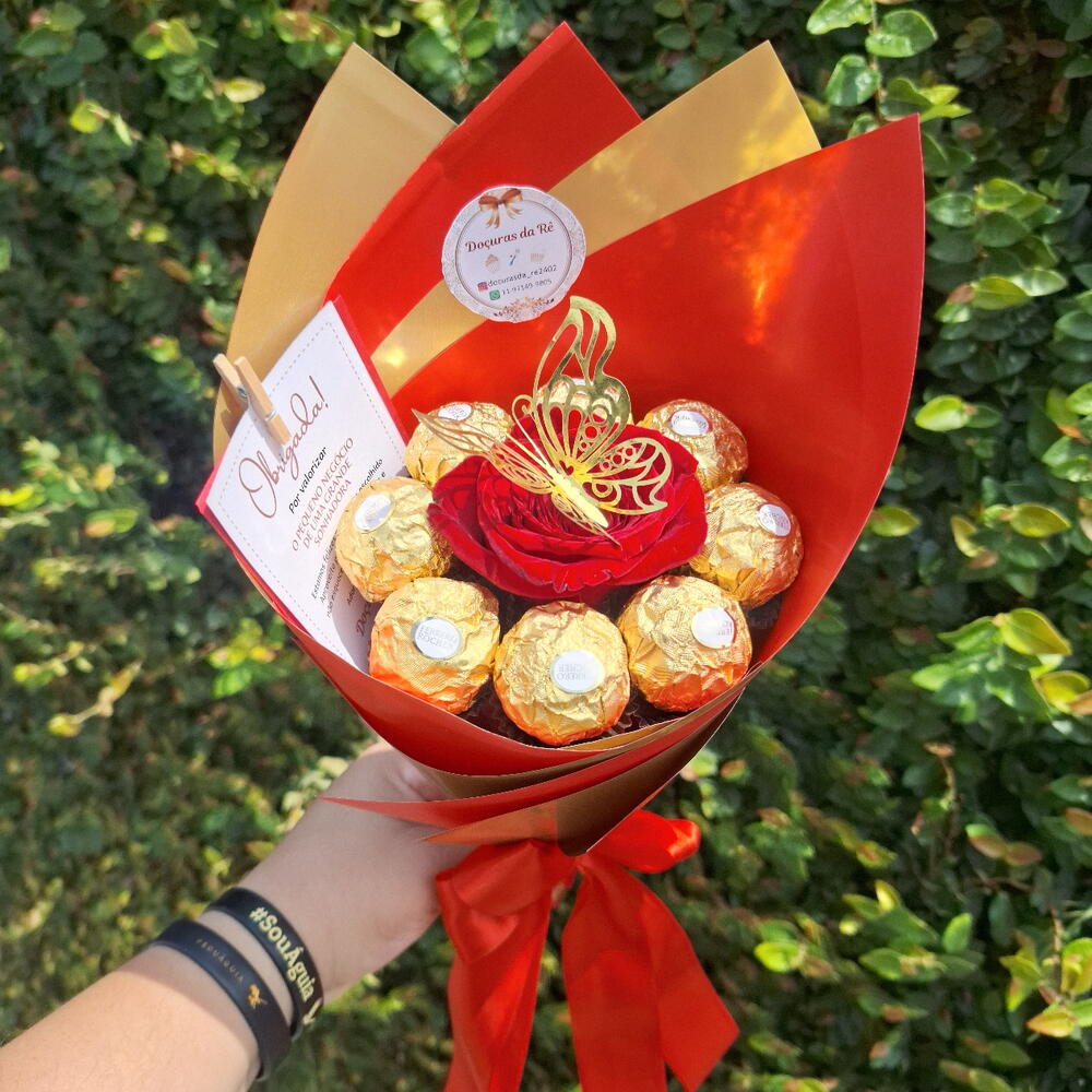 Mini buquê Ferrero Rocher 8 Ferrero Rocher 1 Rosa Colombiana Natural 1 cartão
