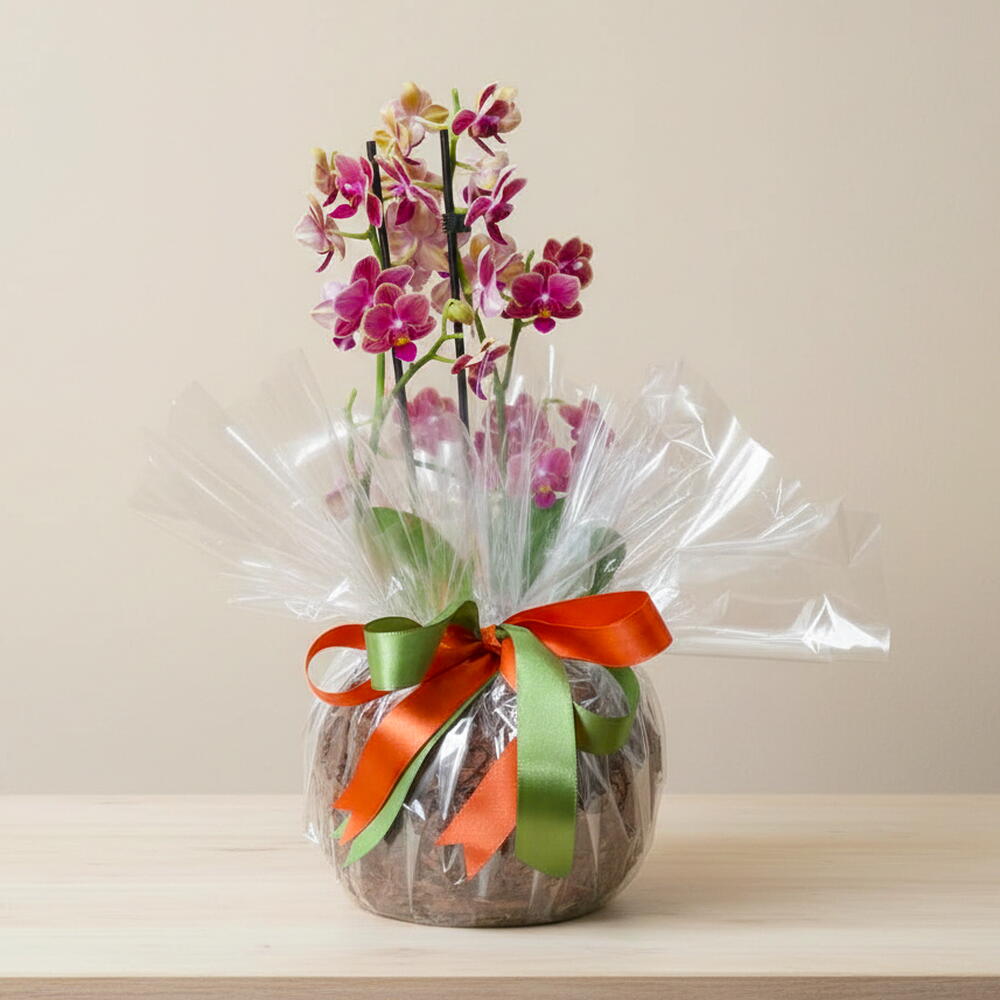 Lindo arranjo de orquídea acompanhado com embalagem celofane e laço de cetim!