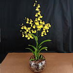 Orquidea chuva-de-ouro decorado na caixa de vidro com casca de pinus