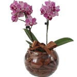 Orquidea plalaenopsis baby cor-de-rosa no vidro aquarinho com casca de pinus