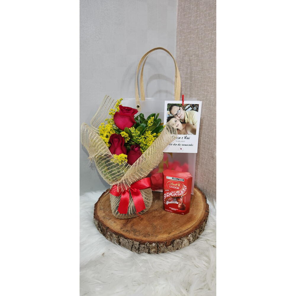 rosa vermelhas - 3 pcs foto - 1 pcs laço em cetim - 1 pcs embalagem tipo tela - 1 pcs trufa lindt - 1 pcs sacola love - 1 pcs