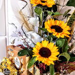 Este presente encantador combina a elegância natural das flores com a doçura indulgente do chocolate. A cesta contém três girassóis brilhantes, complementados por uma unidade de folhagens para um efeito mais exuberante. Para adoçar o presente, incluímos um delicioso Ferrero Rocher e dois irresistíveis chocolates Ouro Branco. Essa mistura harmoniosa de beleza natural e prazer gourmet torna este presente perfeito para qualquer ocasião.