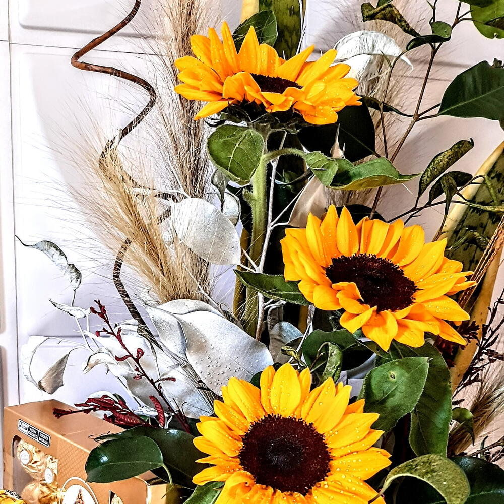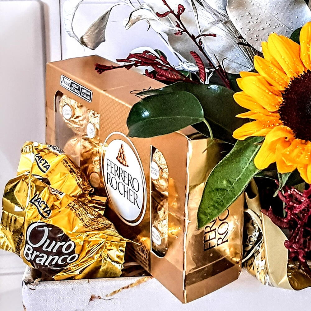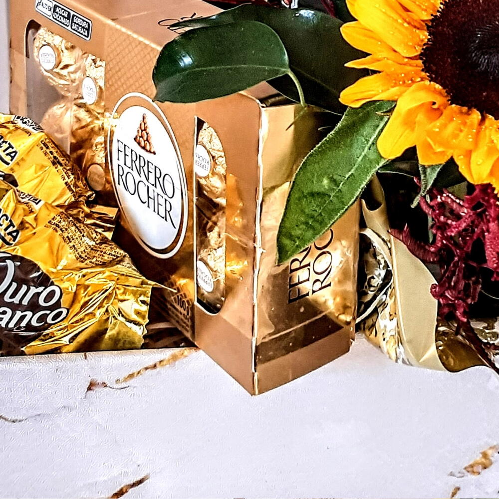 Este presente encantador combina a elegância natural das flores com a doçura indulgente do chocolate. A cesta contém três girassóis brilhantes, complementados por uma unidade de folhagens para um efeito mais exuberante. Para adoçar o presente, incluímos um delicioso Ferrero Rocher e dois irresistíveis chocolates Ouro Branco. Essa mistura harmoniosa de beleza natural e prazer gourmet torna este presente perfeito para qualquer ocasião.
