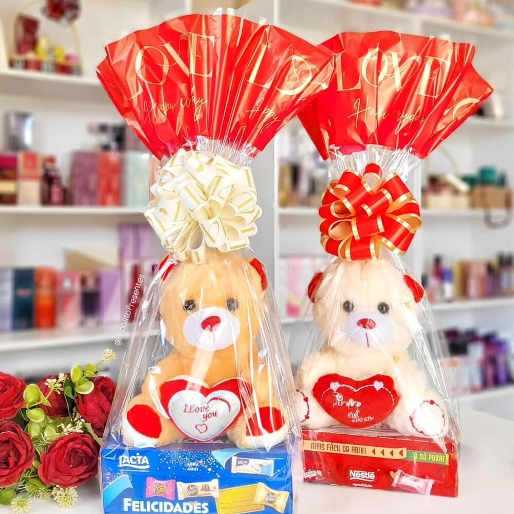 🌹 **Surpreenda quem você ama com este presente encantador!** 🌹 Este conjunto adorável inclui dois ursos de pelúcia, um em tom bege e outro em branco, cada um segurando um coração vermelho que simboliza todo o amor que você deseja transmitir. 🌟 **Detalhes do Presente:** • _Ursos de pelúcia_ macios e aconchegantes • Embalagem delicada em celofane, adornada com laços vermelhos e dourados • Acompanhado por caixas de chocolates Lacta e Nestlé, perfeitos para adoçar o momento • Um toque especial com um pequeno buquê de rosas vermelhas Este presente é ideal para o Dia dos Namorados ou qualquer ocasião especial. Mostre seu carinho de uma forma única e inesquecível! 💖