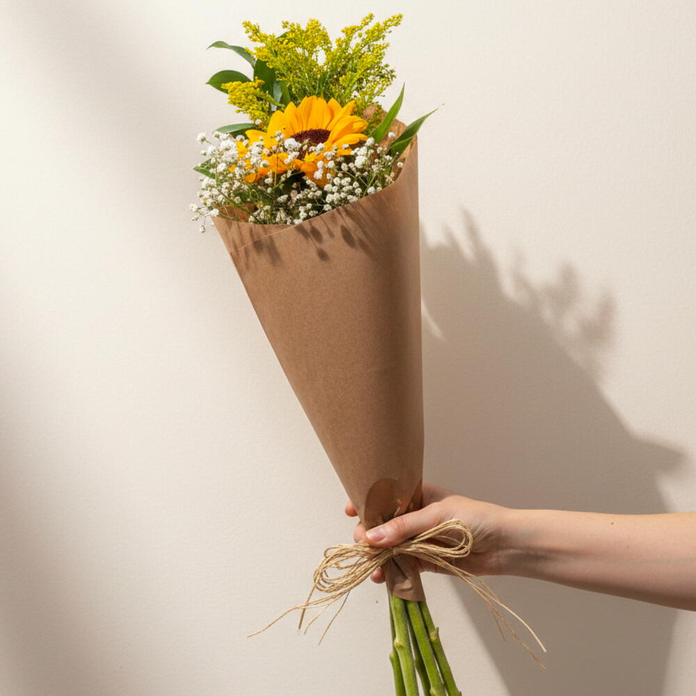 Este lindo buquê explora a beleza natural dos girassóis, acompanhados de uma folhagem cuidadosamente selecionada, realçando o esplendor da flora. Vem acondicionado numa embalagem de designer exclusiva para proteger e aprimorar sua apresentação. E, para completar a elegância, o conjunto é firmemente amarrado com um laço delicado. Perfeito para presentear alguém especial ou simplesmente para enfeitar a sua casa com um toque de sol e natureza.