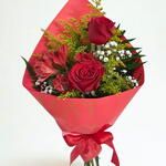 Este belo buquê é composto por duas deslumbrantes rosas, cuidadosamente acentuadas com uma única unidade de folhagens. A apresentação deste presente é acentuada com uma elegante embalagem e um sofisticado laço, tornando-o a escolha perfeita para um sinal de amor ou um gesto de apreço. Surpreenda alguém especial com esta requintada selecção floral.