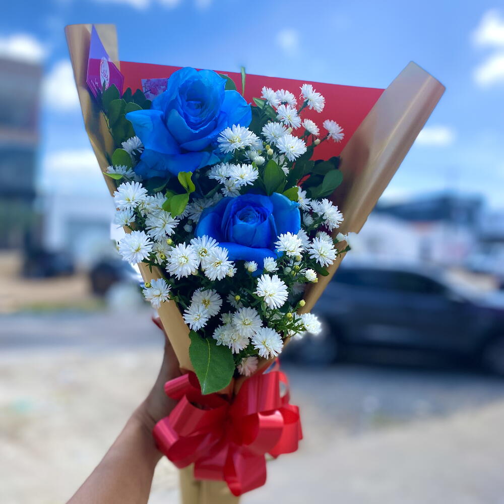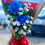 Exude elegância e delicadeza com este buquê encantador. Composto por 2 unidades de rosa azuis - ícones de sofisticação e mistério, complementadas com 1 arranjo floral que adiciona uma pitada de colorido e vivacidade. Cada buquê é cuidadosamente embalado em uma embalagem de alta qualidade e ornamentado com um laço charmoso para apresentar um acabamento impecável. Surpreenda seus entes queridos com este buquê deslumbrante e torne seus momentos ainda mais especiais.