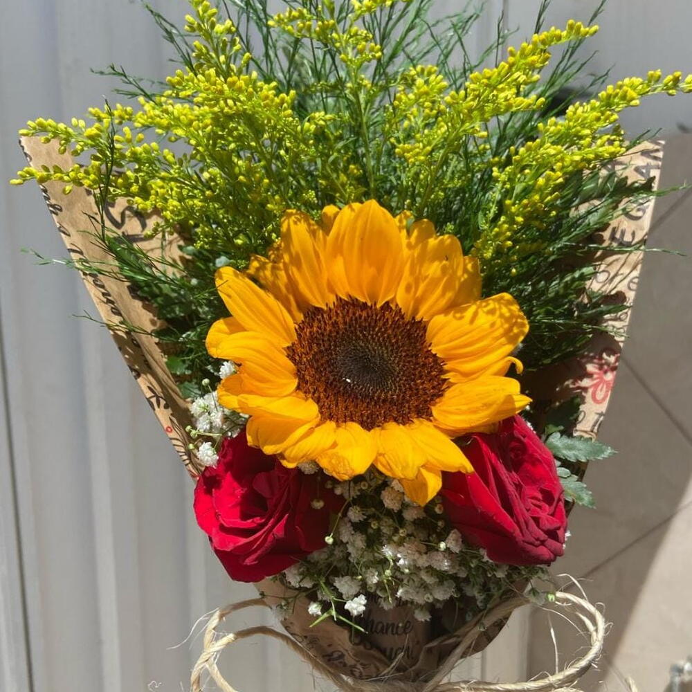 Um buquê extraordinário, composto por 2 rosas vermelhas apaixonantes e um girassol radiante, apresentando ainda um complemento especial para adicionar um toque final a esta criação floral impressionante. Esta beleza é a escolha perfeita para expressar sentimentos sinceros e profundos.