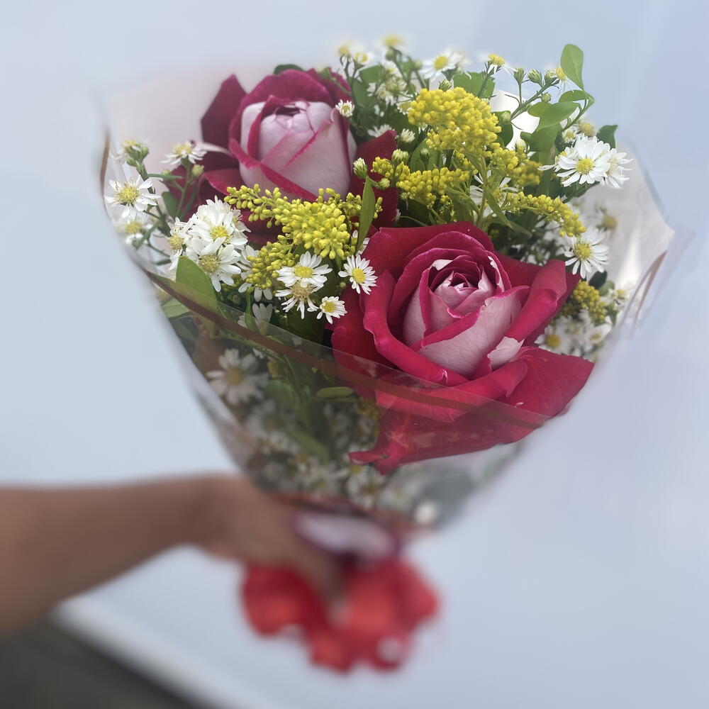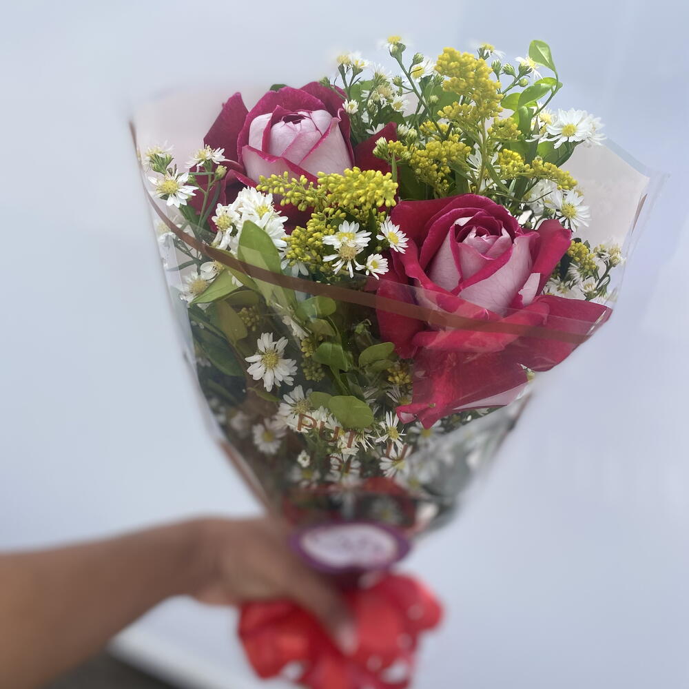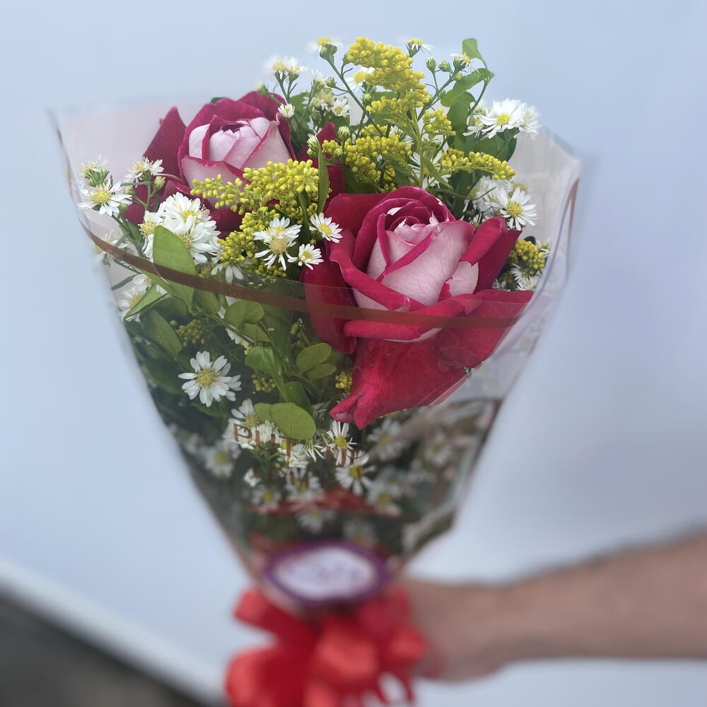 Encante alguém especial com este buquê delicadamente composto por 2 rosas impecáveis. Complementado pela suave harmonia de 2 folhagens selecionadas à mão, este buquê é apresentado em uma embalagem elegante e se destaca ainda mais com o toque final de um laço. Ideal para momentos em que você deseja expressar seu amor, gratidão ou qualquer outro sentimento precioso.