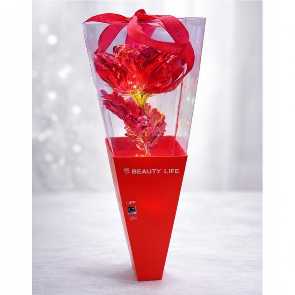 Uma rosa iluminada que simboliza amor intenso e eterno. Com luzes LED coloridas integradas, ela cria um efeito brilhante e apaixonante, perfeita para surpreender em datas especiais. Acompanha embalagem elegante com laço decorativo e botão liga/desliga, transformando o presente em uma lembrança linda e duradoura. ❤️✨ Consulte a disponibilidade de cor