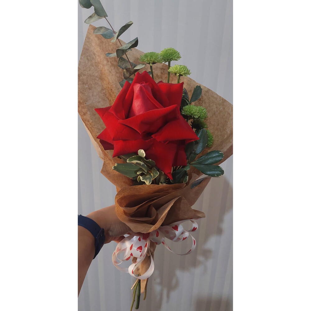 Este buquê deslumbrante, composto por uma rosa solitária cuidadosamente selecionada, é um verdadeiro retorno à elegância clássica. Inserida numa embalagem de papel de alta qualidade e realçada com folhagens requintadas, esta rosa única transforma qualquer ocasião num momento especial. A finalização com um laço bonito adiciona o toque final perfeito para um presente elegante e memorável.