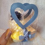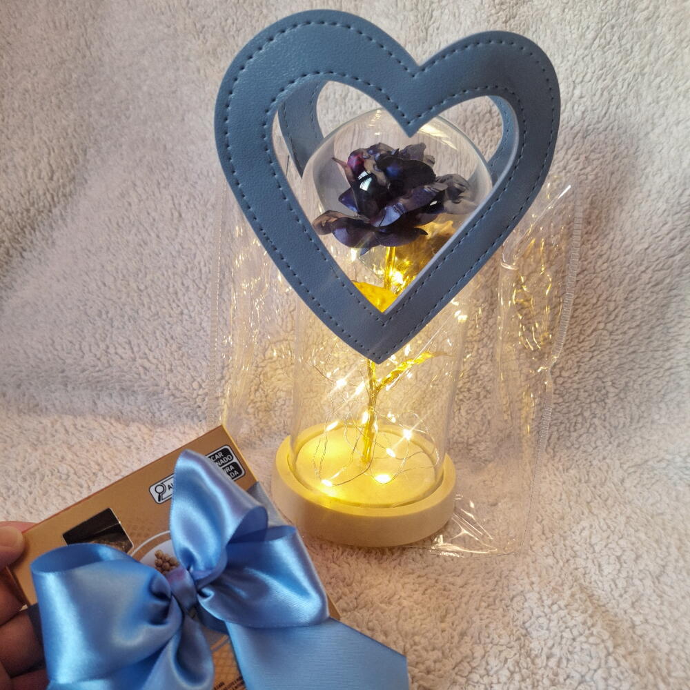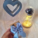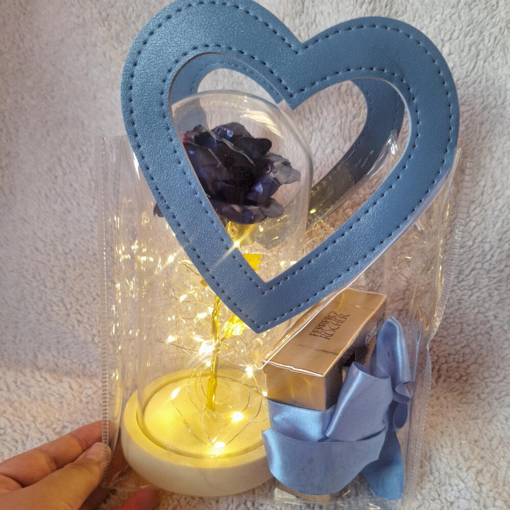 Rosa Artificial Azul Escuro na cúpula de vidro . 1 Sacola Transparente Alça Coração Acompanha 3 pilhas 1 Ferrero Rocher 4 unidades Brinde 2 Fotos Polaroid