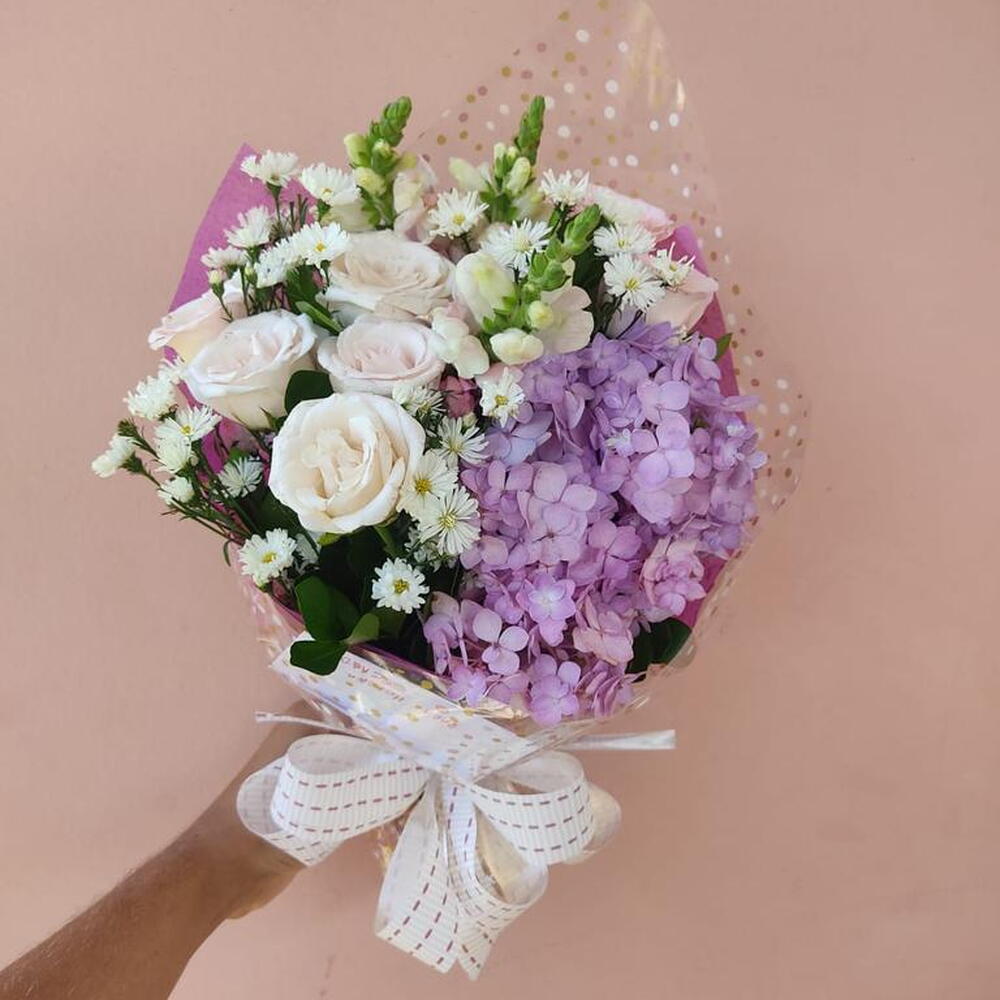 Este deslumbrante arranjo de flores é composto por cinco elegantes rosas chá, cuidadosamente harmonizadas com um mix de hortênsias. A beleza natural das flores é ainda mais potencializada por uma delicada folhagem e flores decorativas que acompanham o conjunto. Tudo vem acondicionado em uma embalagem personalizada, oferecendo um toque final de sofisticação e exclusividade. Este arranjo é a escolha perfeita para presentear em datas especiais ou simplesmente para trazer cor e frescor para o seu espaço.