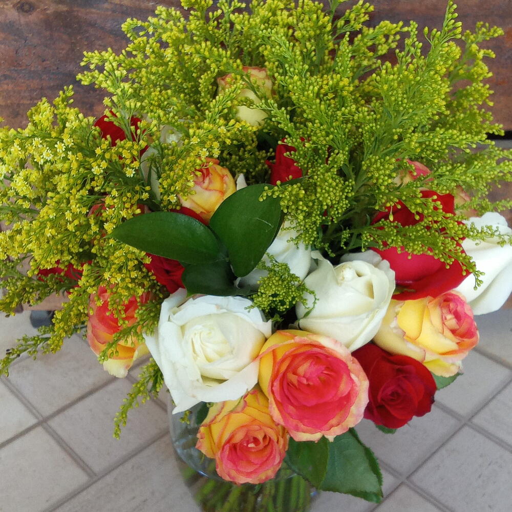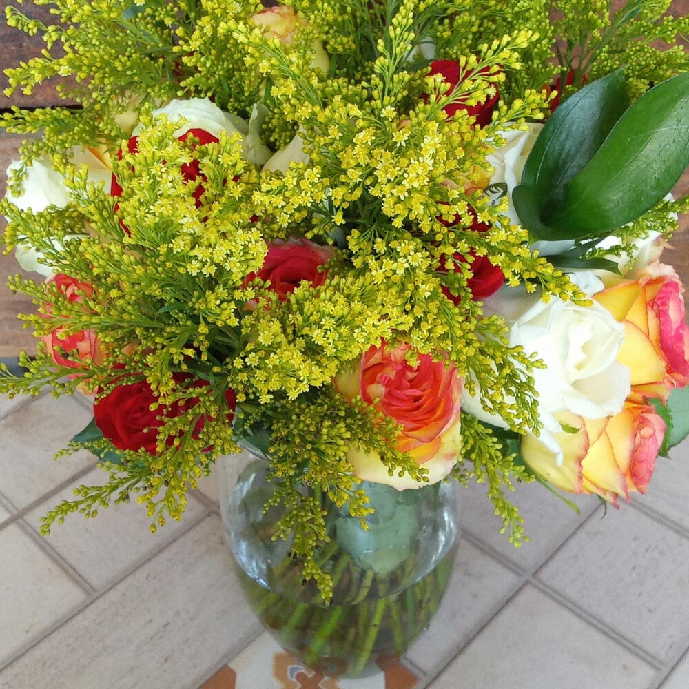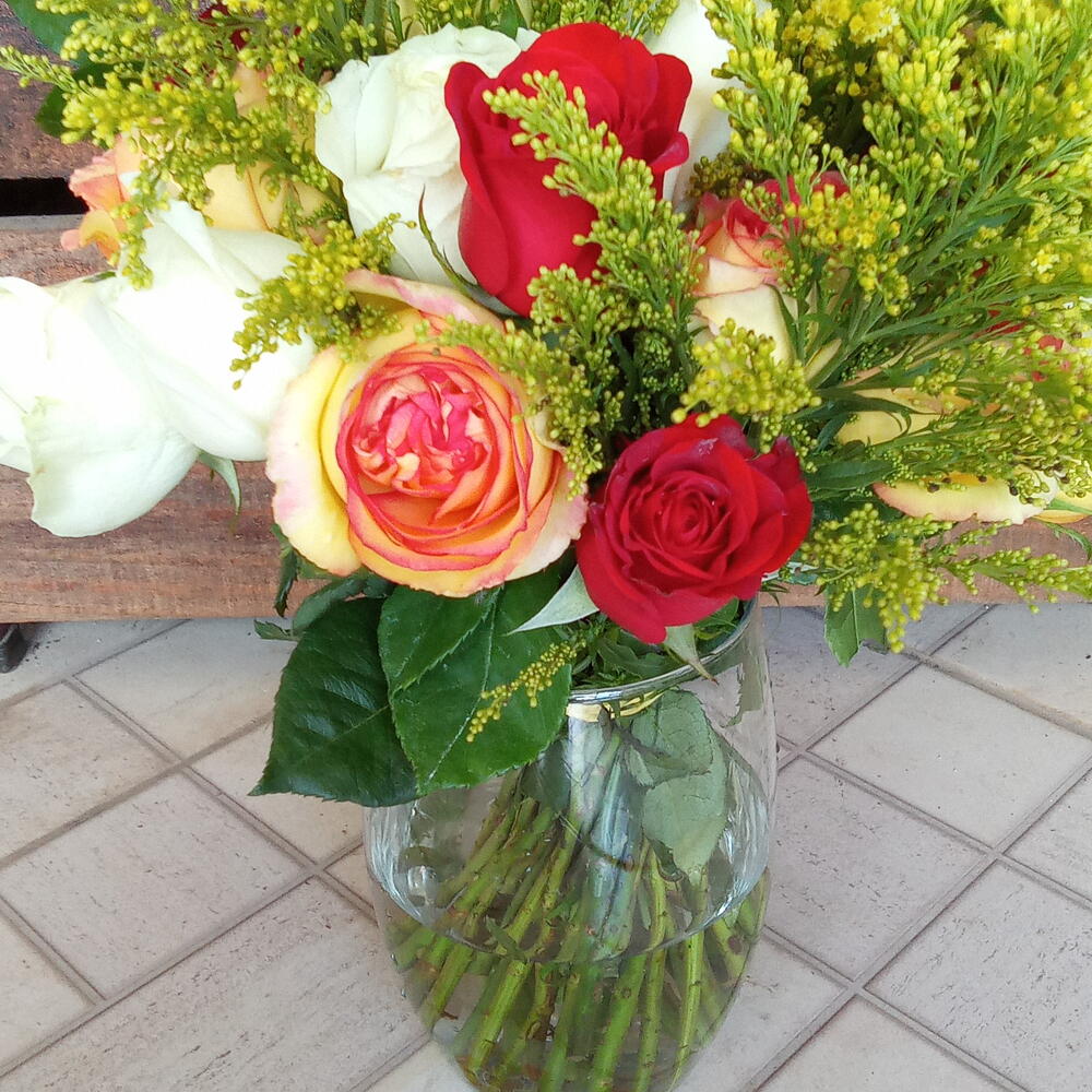 Deslumbre-se com a beleza e o frescor das rosas coloridas neste item encantador. Composto por 24 unidades de rosas coloridas Tango ou folhagens, este arranjo faz uma exibição impressionante. Incluído no conjunto vem também um vaso de vidro, elevando ainda mais a estética com um toque contemporâneo. É uma peça que com certeza vai trazer beleza e uma dose de natureza ao seu espaço.