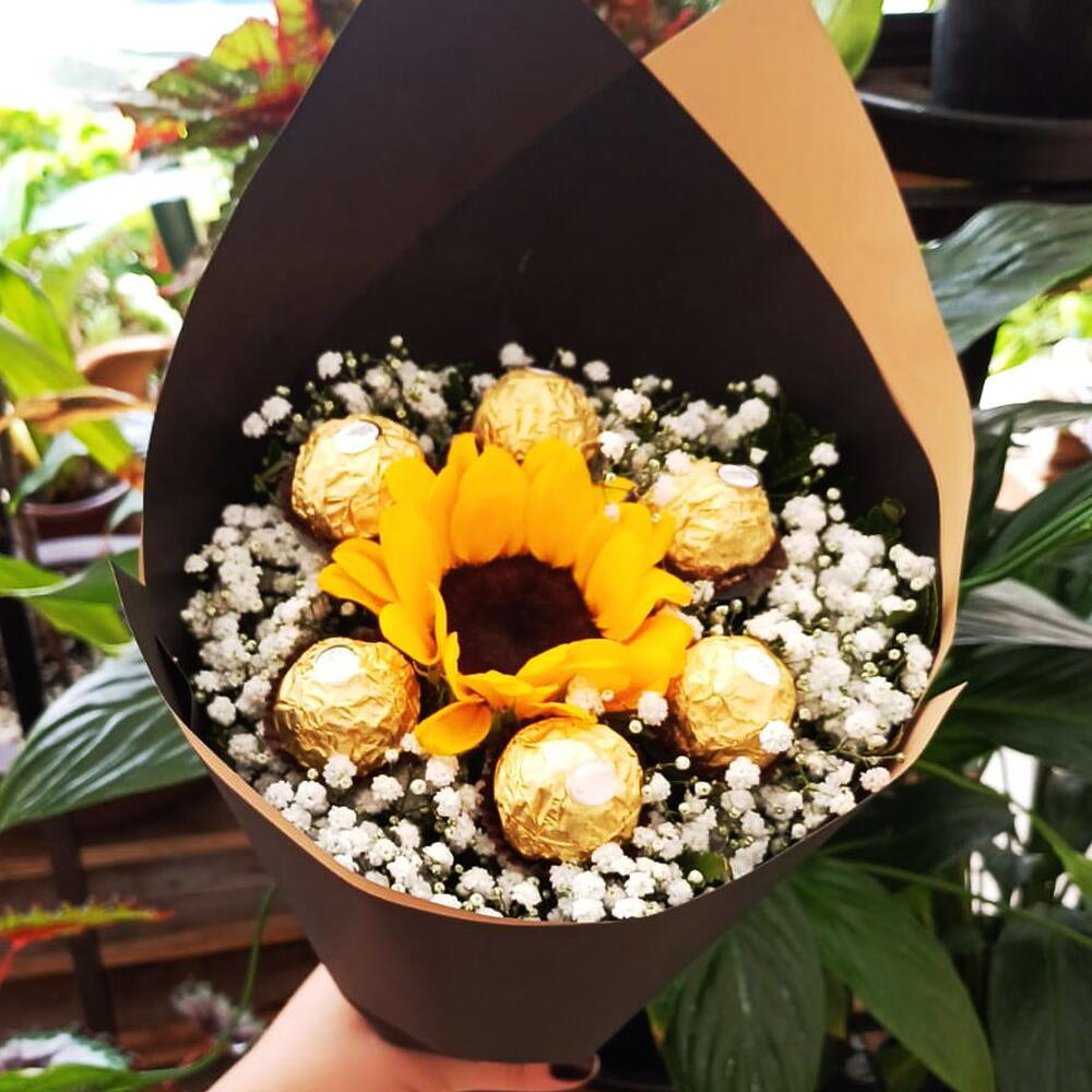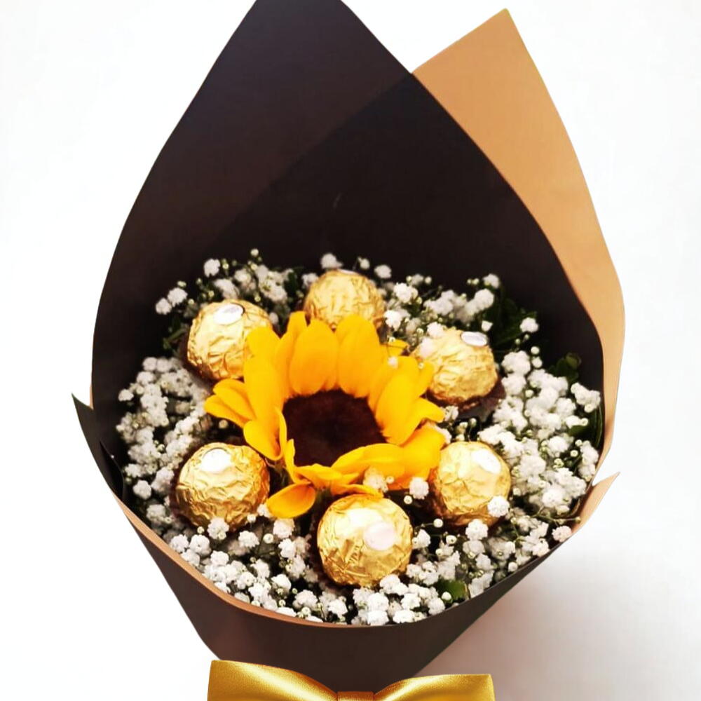 Este buquê é a própria representação da alegria, composto por uma radiante girassol, acompanhada de 6 deliciosos bombons Ferrero Rocher. Ornam também o conjunto uma unidade de delicados mosquitinhos. O arranjo é gentilmente embalado e acompanha um lindo laço, dando um toque final de elegância e requinte. Ideal para surpreender e emocionar quem você ama.