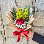Este buquê elegante e simplista composto por um solitário destaque, uma rosa vermelha exuberante, encanta todos à primeira vista. Acompanhando sua majestade, está um suave toque de folhagem que adiciona um elemento natural irresistível ao conjunto. A embalagem chique e sofisticada, complementada por um laço delicado, garante um mimo pronto para qualquer ocasião íntima. Se entregue ao encanto desta harmoniosa união entre beleza e simplicidade.