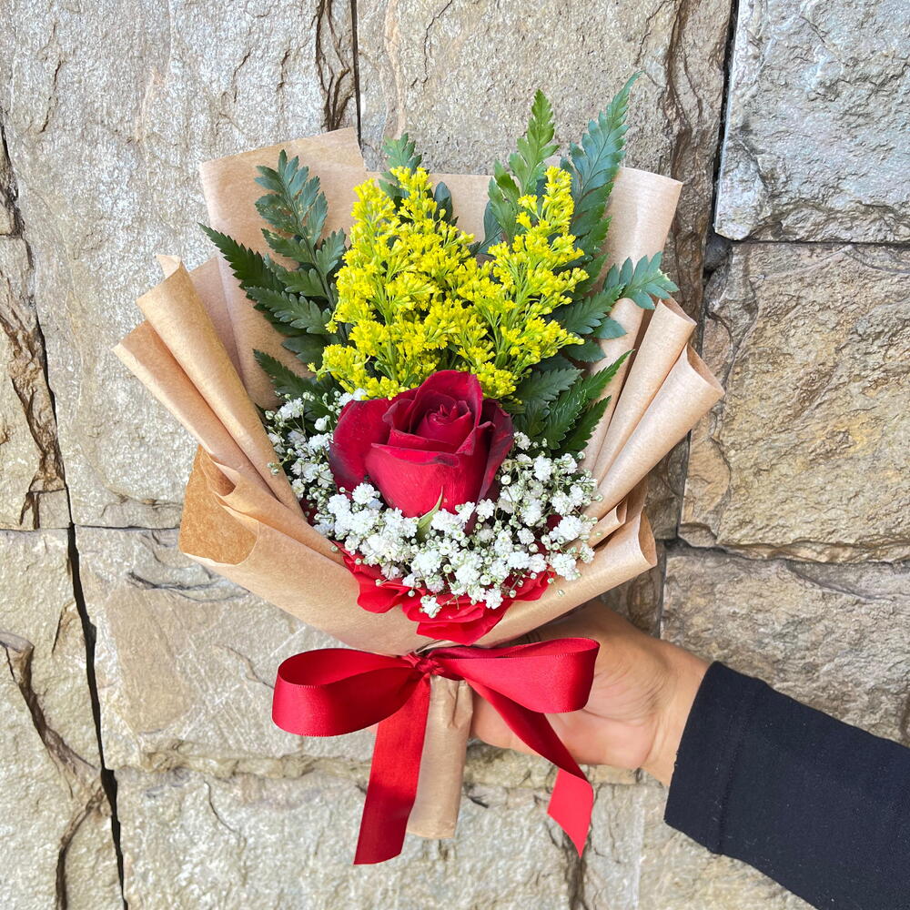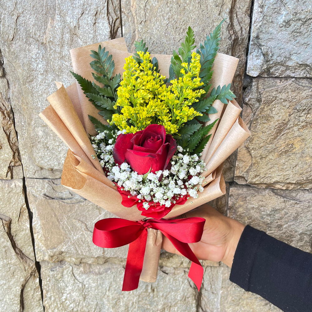 Este buquê elegante e simplista composto por um solitário destaque, uma rosa vermelha exuberante, encanta todos à primeira vista. Acompanhando sua majestade, está um suave toque de folhagem que adiciona um elemento natural irresistível ao conjunto. A embalagem chique e sofisticada, complementada por um laço delicado, garante um mimo pronto para qualquer ocasião íntima. Se entregue ao encanto desta harmoniosa união entre beleza e simplicidade.