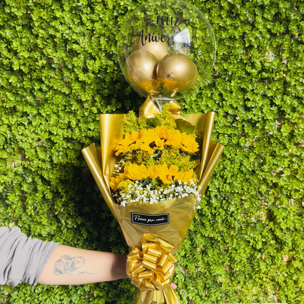 Um presente vibrante, alegre e cheio de significado para iluminar o dia de alguém especial! Este kit encantador acompanha: • 🌻 1 Ramalhete com 6 Girassóis – flores que transmitem luz, positividade e boas energias • 🎈 1 Balão personalizado – que completa a surpresa com charme e carinho ✨ Ideal para aniversários, agradecimentos, celebrações ou para levar um sorriso cheio de cor e afeto a quem você ama.