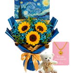 embalagem de designer - 1 pcs folhagens - 1 pcs girassol - 3 pcs laço - 1 pcs ursinho de pelúcia - 1 pcs desenho van gogh - 1 pcs colar (verificar disponibilidade) - 1 pcs