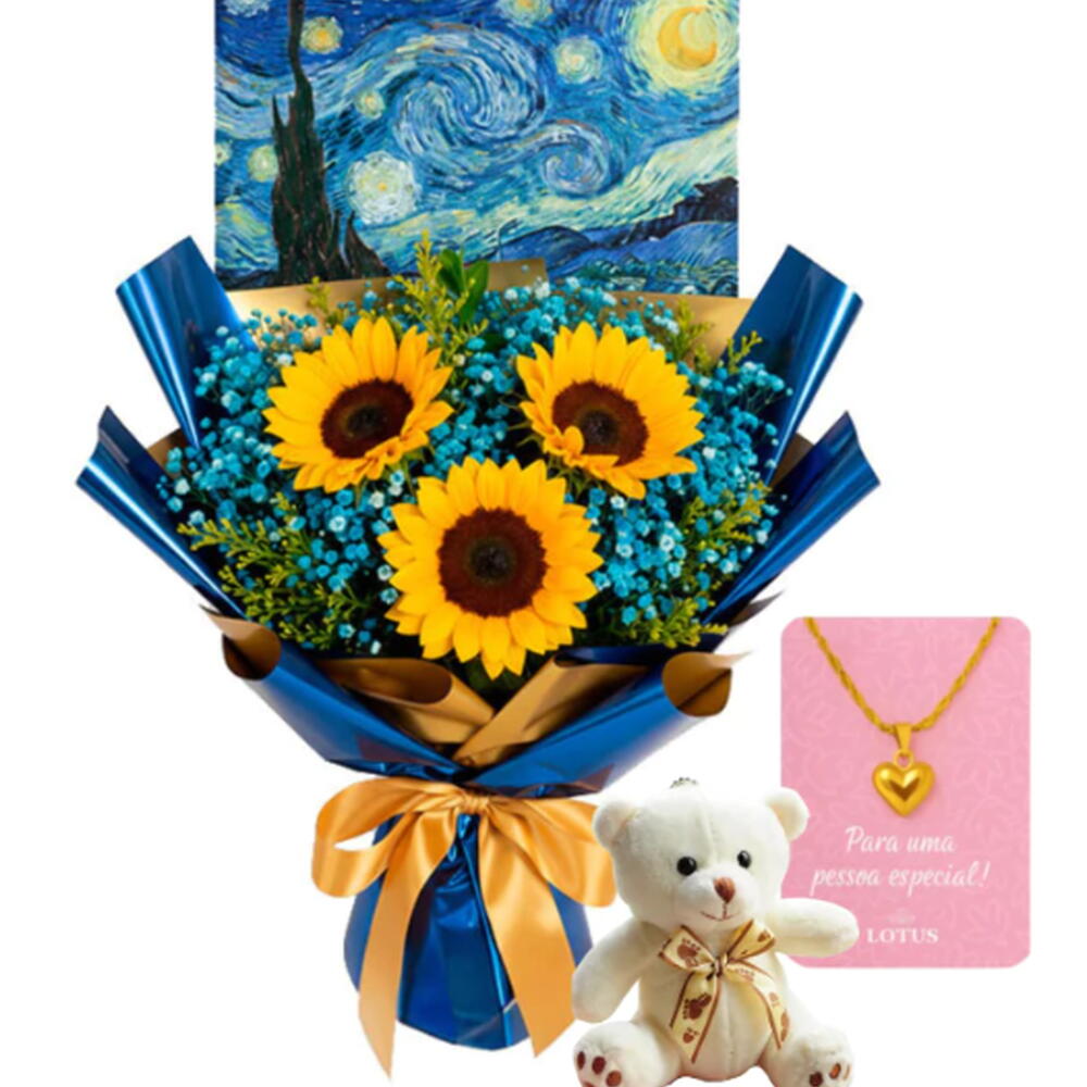 Trio de Girassois Noite Estrelada com Colar e Ursinho Piticoㅤㅤ