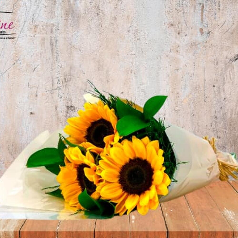 Encante alguém especial com este belo buquê composto por 3 deslumbrantes girassóis, harmoniosamente combinados com 1 unidade de folhagens frescas. Este arranjo alegre e vibrante é perfeitamente embalado em uma elegante embalagem e finalizado com um laço elegante. Uma escolha ideal para qualquer ocasião.