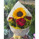 Este cativante buquê é uma composição encantadora de três rosas vermelhas intensas e um girassol vibrante, com a frescura das folhagens e complementos. Tudo delicadamente embrulhado e finalizado com um elegante laço. É uma escolha magnífica para expressar seus sentimentos mais profundos.