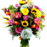 Celebre a beleza da natureza com este encantador vaso de vidro, estrategicamente arranjado com dois girassóis brilhantes e hortências, complementados por uma folhagem única. Seja para alegrar a sua casa ou como um presente pensativo, este arranjo floral trará um toque de cor e frescura a qualquer espaço.