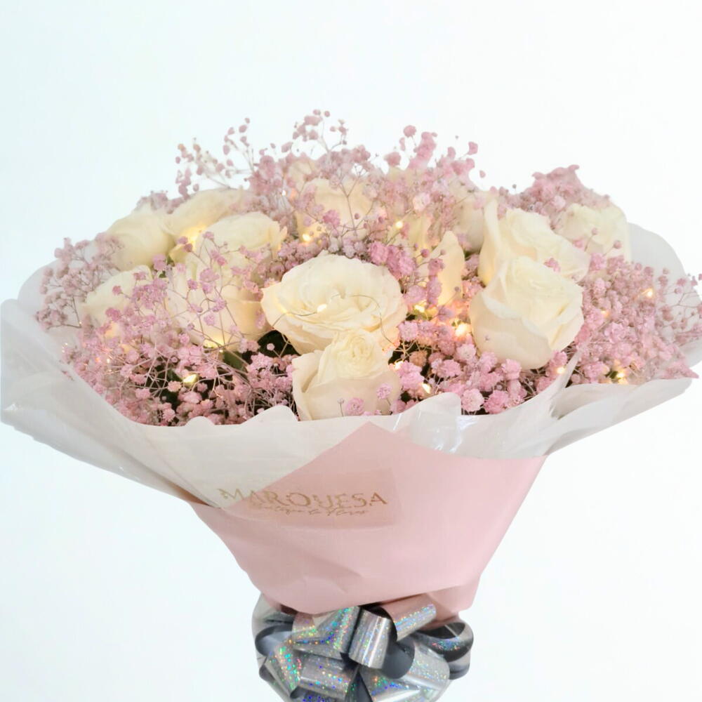 Deixe-se encantar pela opulência da nossa categoria Bouquet, um conjunto deslumbrante de 12 rosas delicadas e requintadas, complementadas por 6 rosas gipsófilas rosa-claro. Cada flor é selecionada manualmente pela sua beleza e charme, criando um espetáculo fascinante de cores e emoções. O bouquet é então iluminado por uma luz de fada de 2 metros, que lança um brilho místico sobre o arranjo, perfeito para ocasiões verdadeiramente memoráveis. Testemunhe a transformação do seu ambiente com este toque de elegância – um adorno que transcende a estética.