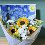 embalagem - 1 un. laço - 1 un. desenho van gogh - 1 un. folhagens especias - 1 un. girassol de van gogh - 3 un.
