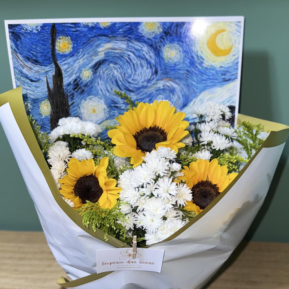 Este bouquet exclusivo é o epítome da beleza e da arte, composto por três Girassóis de Van Gogh singulares, acompanhados por uma elegante folhagem especial. Cada detalhe nesta composição foi pensado com cuidado, incluindo uma encantadora representação artística de um dos desenhos de Van Gogh. O bouquet é delicadamente acondicionado numa requintada embalagem e atado com um laço sofisticado para acentuar ainda mais a sua estética. Este é não só um presente floral, mas também uma peça de arte.