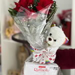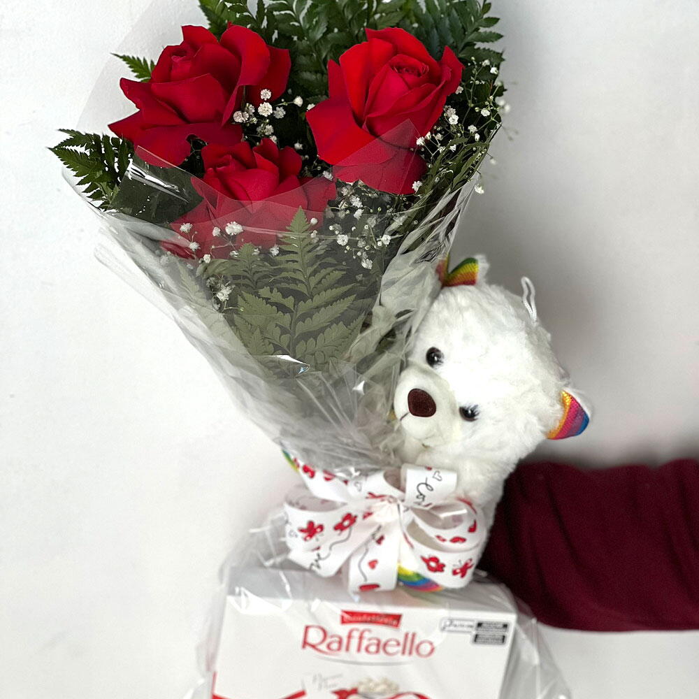 Cative e surpreenda com este buquê exclusivo. Composto por três deslumbrantes rosas importadas, unindo a beleza e o charme clássico, acompanhadas de um ursinho de pelúcia super fofinho de 20cm em cores variadas, trazendo um toque adorável e aconchegante para a sua surpresa. E para completar, uma deliciosa caixa com 9 unidades de Bombons Raffaello, elevando este buquê a um novo patamar de elegância e doçura. Combine romance e delicadeza em um único presente.