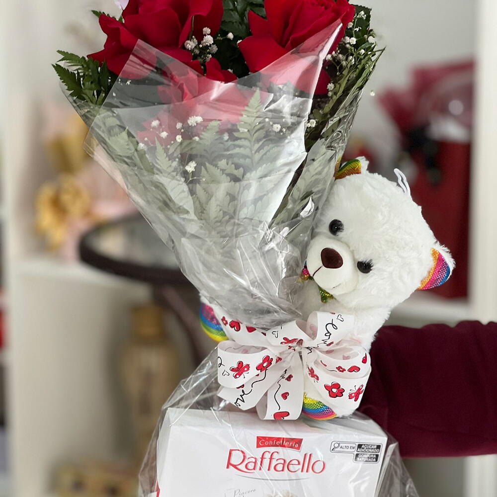 bombons raffaello - 1 un. ursinho 20 cm cor variada - 1 un. rosa tradicionais naturais - 3 un.