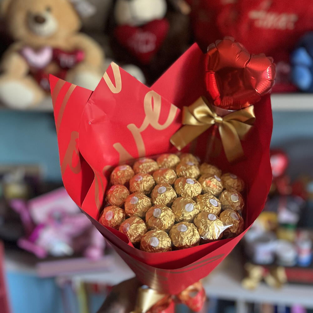 Este buquê sofisticado e elegante em uma embalagem moderna contém 24 peças de Ferrero Rocher cuidadosamente arranjadas. Adornado com um delicado laço de cetim, também inclui um pequeno balão metalizado para adicionar um toque especial. Perfeito para surpreender alguém especial no seu dia.