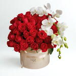 rosa vermelhas - 50 un. orquídea phaleanopsis branca. - 1 un. box elegante com laço de cetim - 1 un.