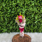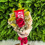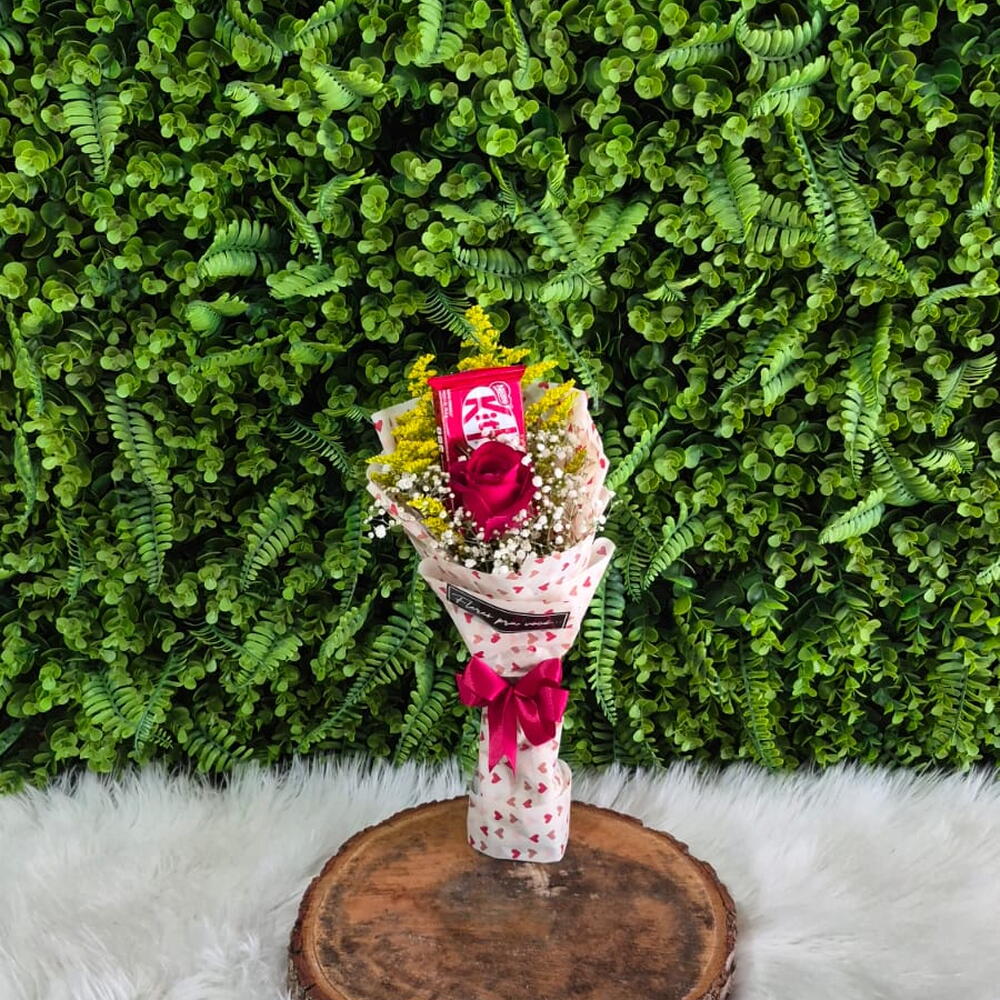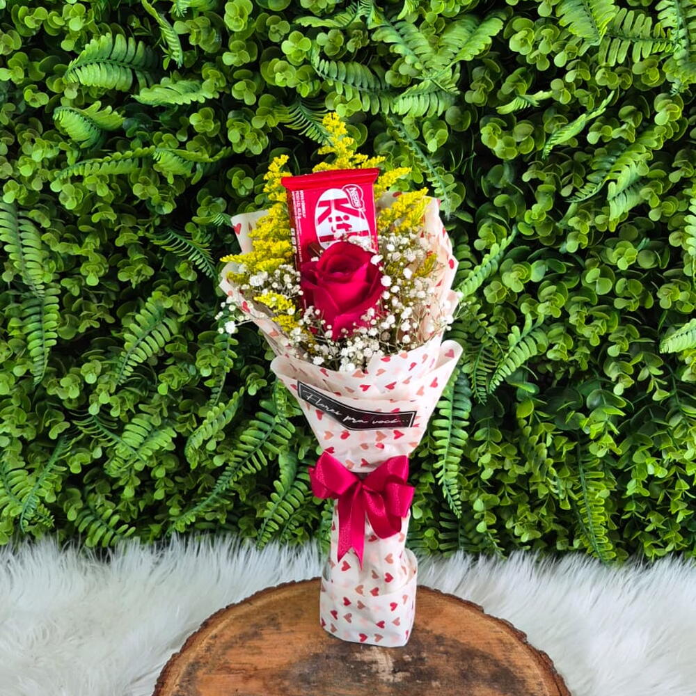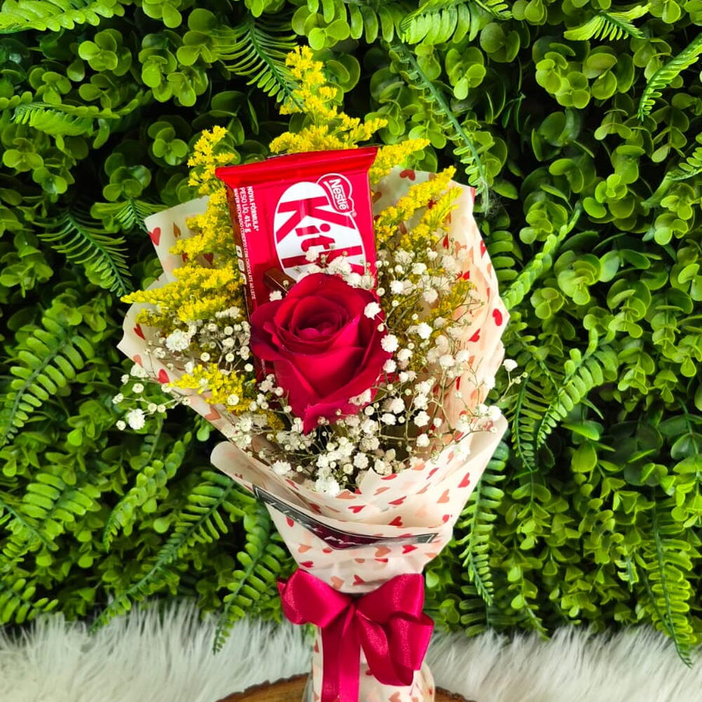 Delicado, romântico e cheio de charme ❤️✨ Este lindo buquê é composto por 1 rosa vermelha, símbolo do amor e da paixão, acompanhada por gypsophila (mosquitinho) e toques de solidago amarelo, que trazem leveza e alegria à composição. Para deixar o presente ainda mais especial, acompanha 1 chocolate KitKat, adicionando um toque doce à surpresa. Embalado com papel decorado com corações e finalizado com laço em cetim, é a escolha perfeita para presentear com carinho em aniversários, datas especiais ou simplesmente para demonstrar seu amor.