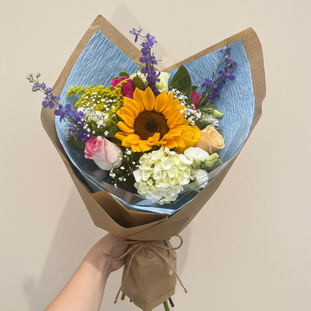 Este fascinante buquê combina a alegria dos girassóis com a sofisticação atemporal da hortênsia e a versatilidade das rosas variadas. Contendo uma unidade de girassol, duas de hortênsia e seis de rosas variadas, cada arranjo é habilmente embalado em uma embalagem inclusiva e acabado com um laço para um toque especial. Este buquê é um presente perfeito para qualquer ocasião ou simplesmente para alegrar o dia de alguém especial.