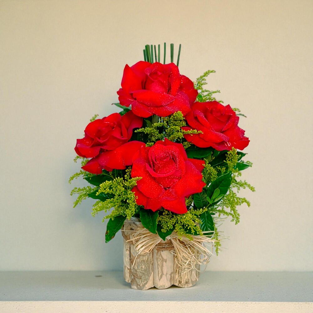 Este delicado arranjo de flores é composto por quatro rosas majestosas que desabrocham perfeitamente, criando um espetáculo de beleza inigualável. O encanto destas rosas é realçado pelo verde luxuriante das folhagens delicadas, proporcionando um contraste visual notável. O arranjo é completado com um elegante cachepô, adicionando um toque rústico ao conjunto. Um presente verdadeiramente sofisticado para ocasiões especiais.