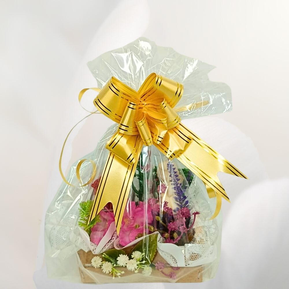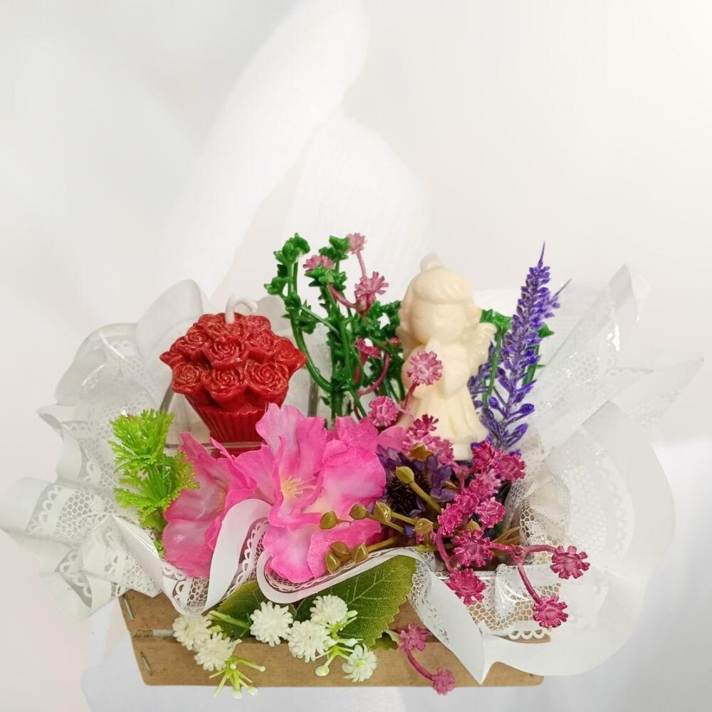 flores artificiais - 1 un. vela - 1 un. saco plástico - 1 un. arranjos complementares de folhas - 1 un. anjo off white - 1 un. engradado de madeira pinus e mdf - 1 un. laço dourado pequeno - 1 un.