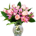 O Arranjo Aurora - Rosas e Astromélias no Vaso, uma criação que exalta a delicadeza e o charme das flores. Com elegantes 8 Rosas rosadas e 5 Astromélias suaves, combinadas com folhagens frescas, este arranjo é disposto em um refinado vaso de vidro que valoriza ainda mais sua beleza. Um presente perfeito para celebrar momentos especiais com sofisticação e carinho.