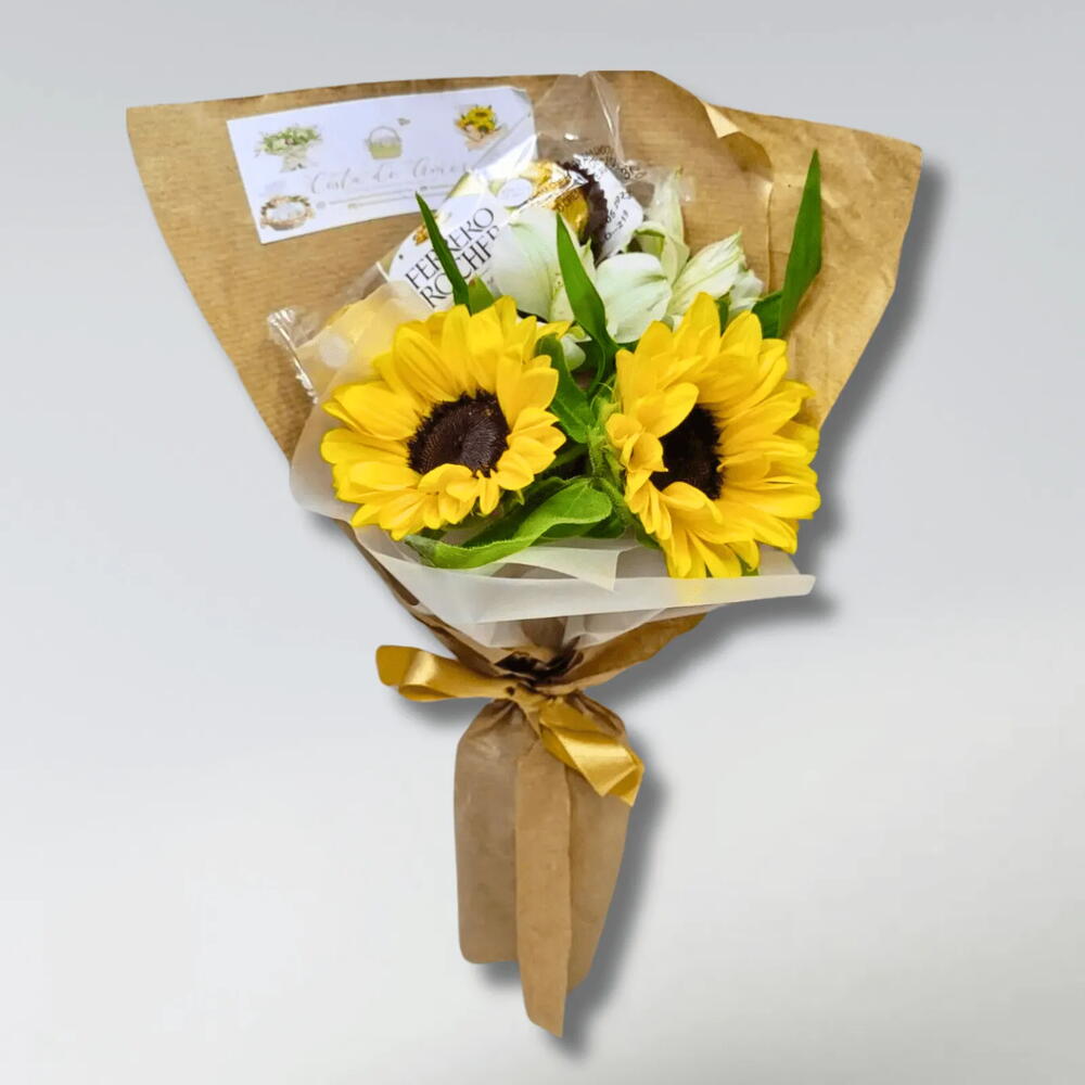 O Arranjo com 2 Girassóis e Ferrero Rocher combina a alegria e o brilho dos girassóis com o delicioso sabor dos chocolates Ferrero Rocher. Este arranjo encantador é perfeito para presentear, seja para celebrar aniversários, congratulações ou simplesmente para alegrar o dia de alguém especial. Uma combinação que transmite calor, felicidade e cuidado em cada detalhe.