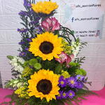 Este arranjo floral é composto por 3 girassóis deslumbrantes, 5 flores campestres encantadoras e folhagens cuidadosamente selecionadas que proporcionam uma atmosfera fresca e vibrante. Todas essas belezas estão elegantemente dispostas em um vaso de vidro transparente, que não só realça as cores vivas do arranjo, como também adiciona um toque de sofisticação a qualquer ambiente. Este arranjo é a combinação perfeita de natureza e design, perfeito para presentear ou simplesmente para iluminar a sua casa.