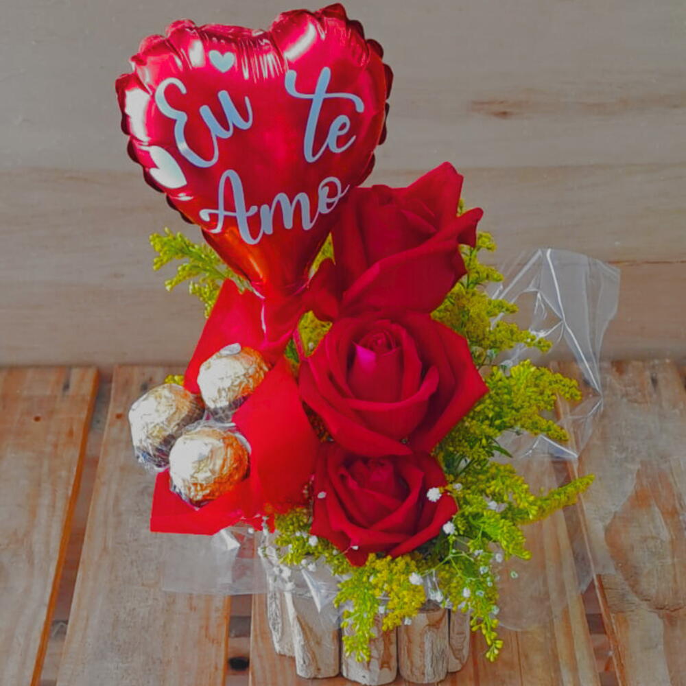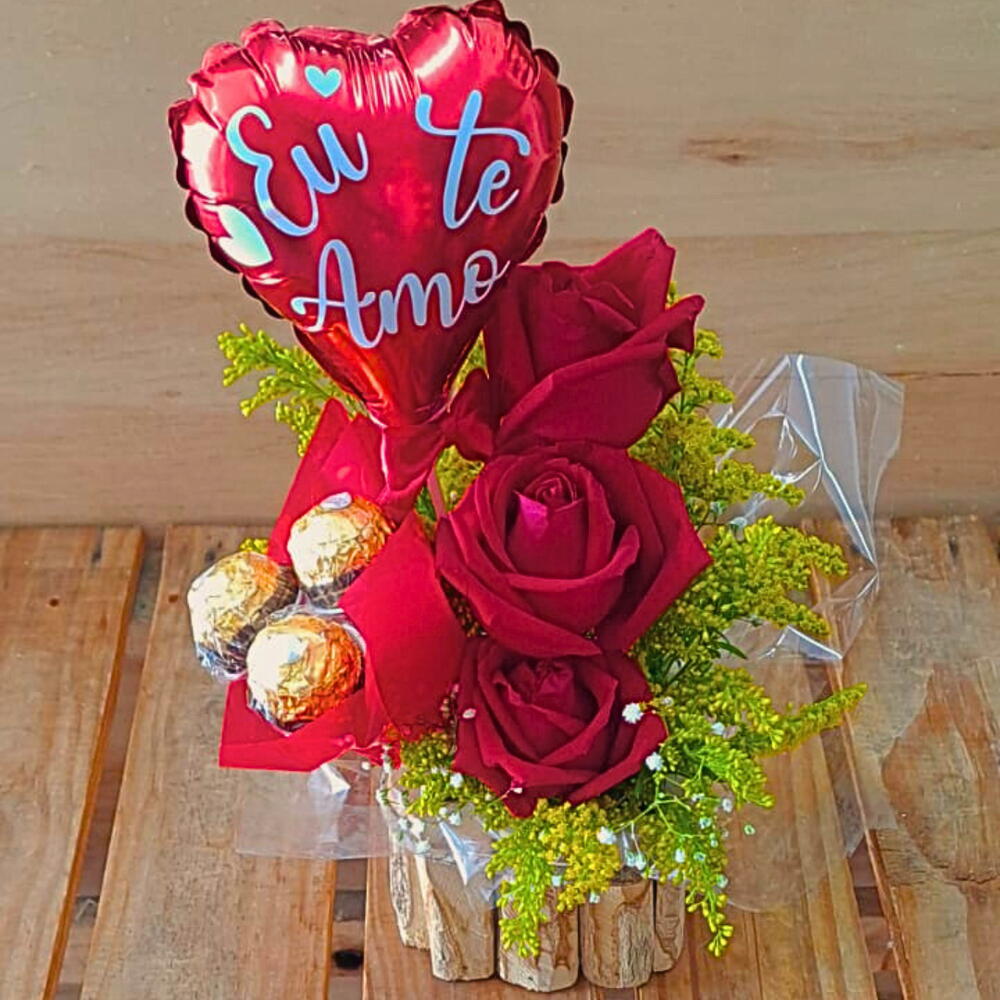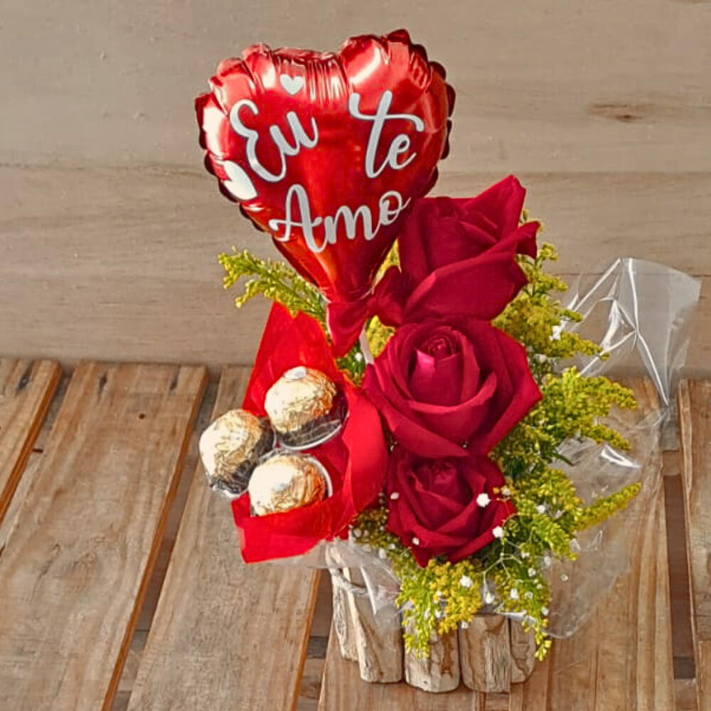 bombons ferrero rocher - 3 un. arranjo com rosa vermelhas - 1 un. mini balão coração - 1 un.