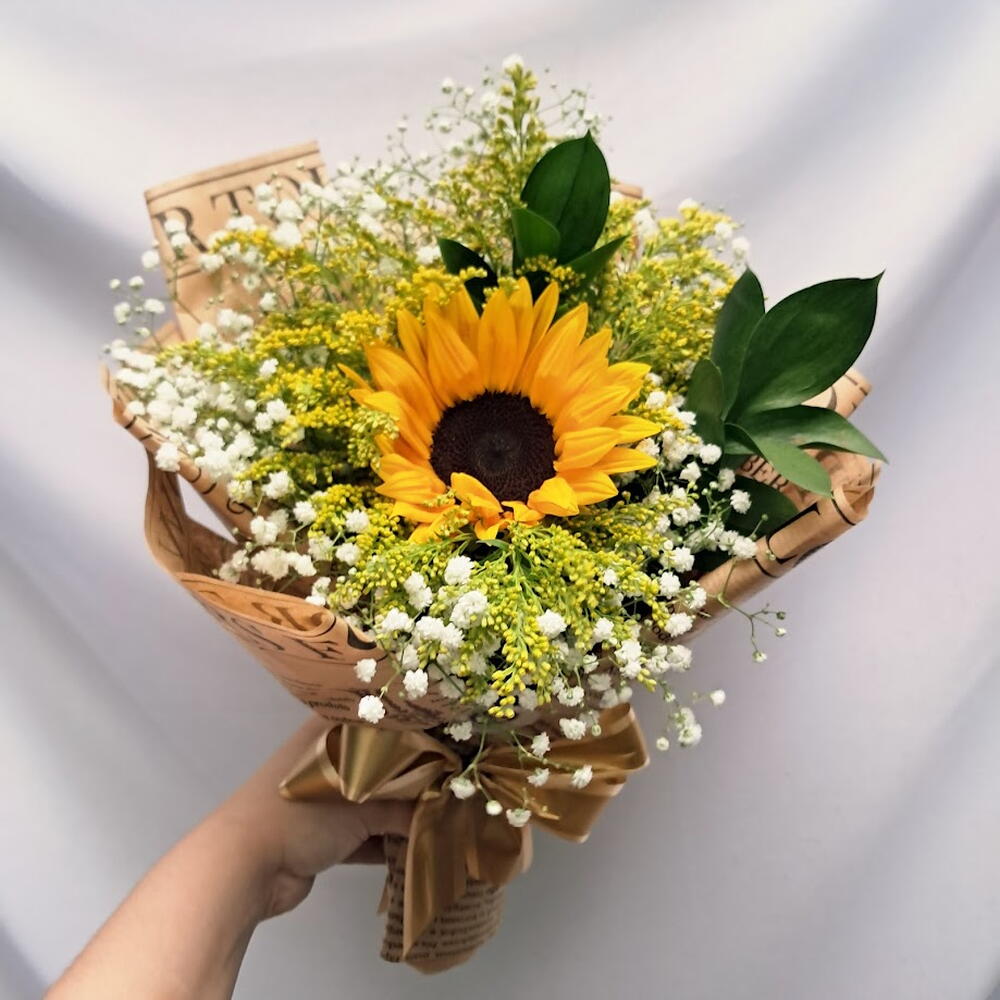 Arranjo delicado com 1 girassol. Composição: 1 girassol natural, folhagens naturais. Um toque de sol e alegria para qualquer ambiente.