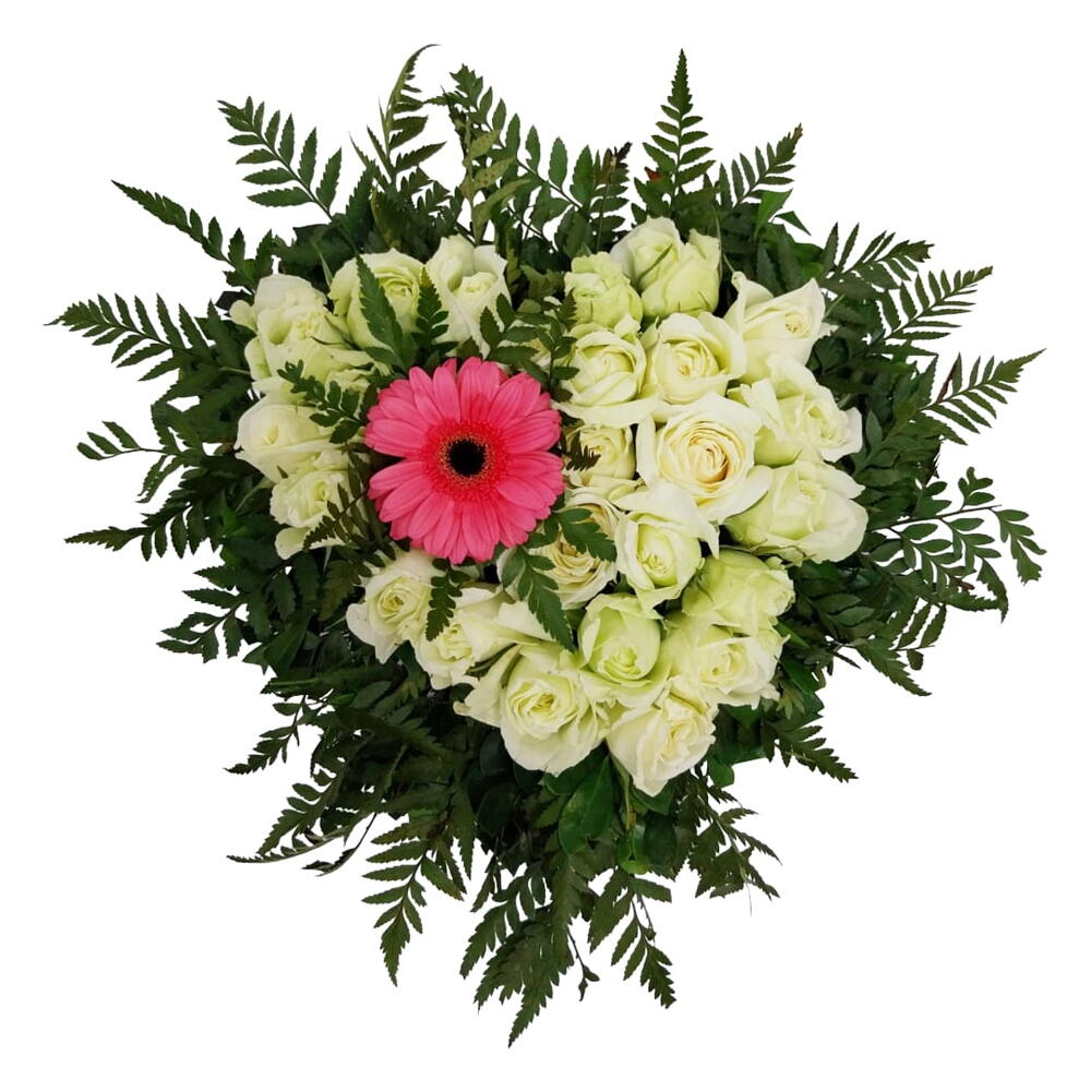 Este arranjo de flores é composto por 30 unidades de folhagens verdejantes, 20 rosas brancas que parecem beijadas pela manhã com suas pétalas impolutas e uma gérbera vibrante que se destaca entre a suavidade do branco. Além disso, o arranjo inclui um coração de madeira de tamanho pequeno, uma singela expressão de amor e carinho. É o presente perfeito para expressar sentimentos e embelezar ambientes. Cada elemento deste arranjo foi cuidadosamente selecionado para criar um equilíbrio visual e emocional.