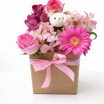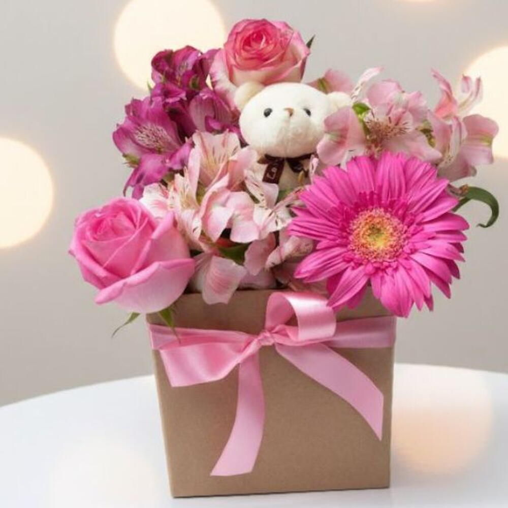 gerbera - 1 un. astromelias - 4 un. rosa naturais - 2 un. caixa em papel rigido decorado com laço de fita e cartão - 1 un. mini ursinho em foramto de chaveirinho - 1 un.
