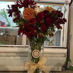 laço de cetim - 1 un. flores variadas - 20 un. vaso de vidro g - 1 un.